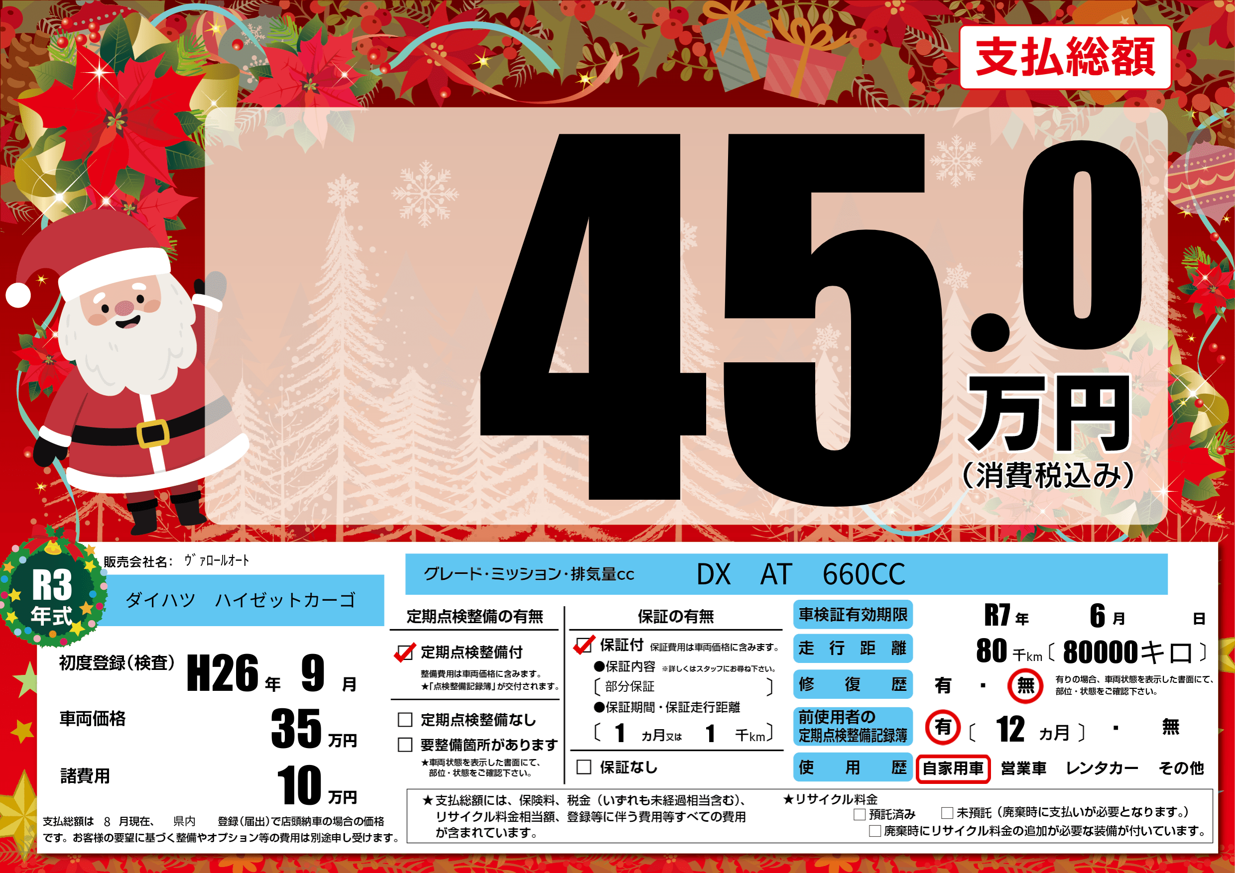 | 車名 | ダイハツ ハイゼットカーゴ | グレード ミッション 排気量 |