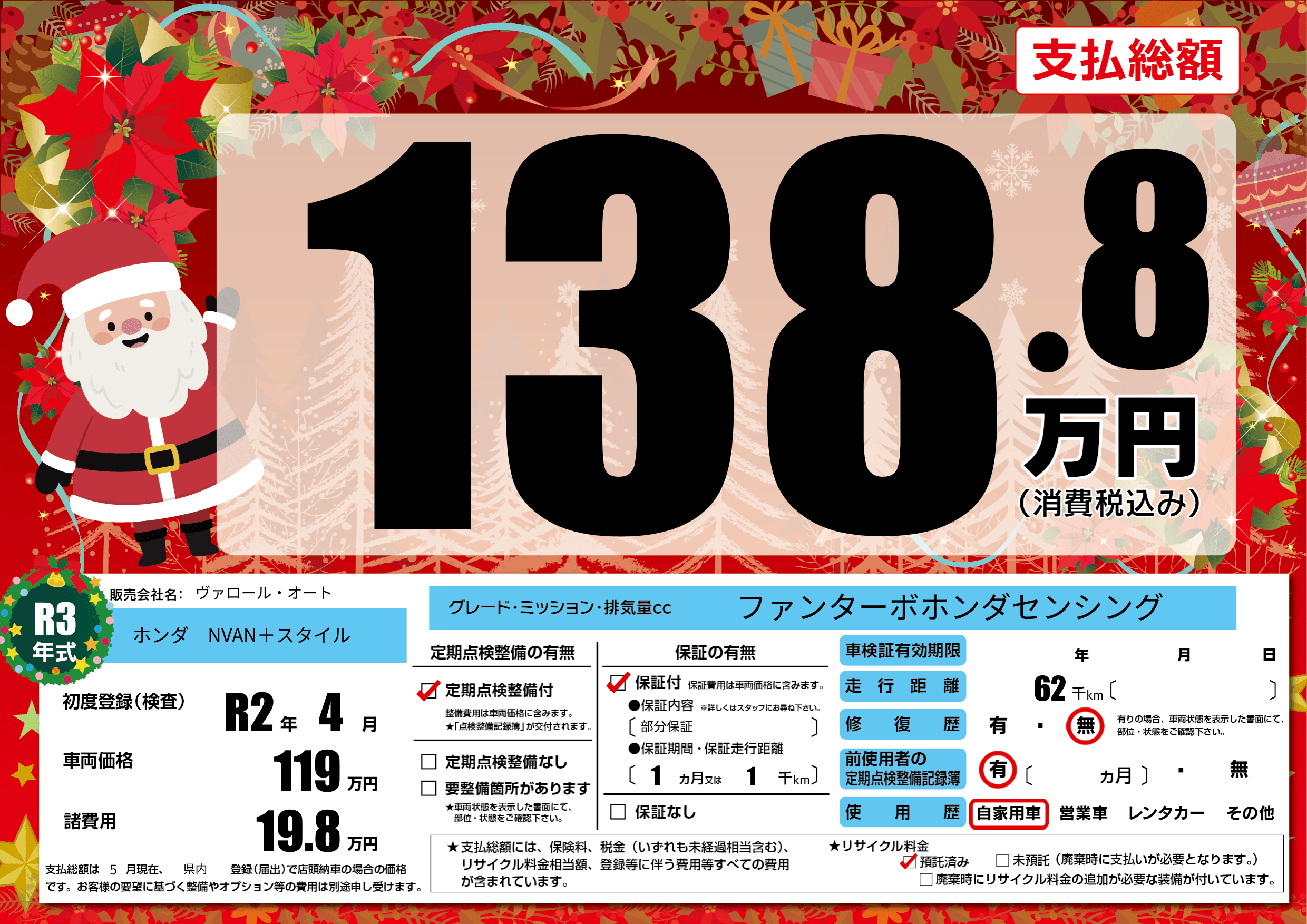 | 車名 | ホンダ NVAN+スタイル | グレード ミッション 排気量 |