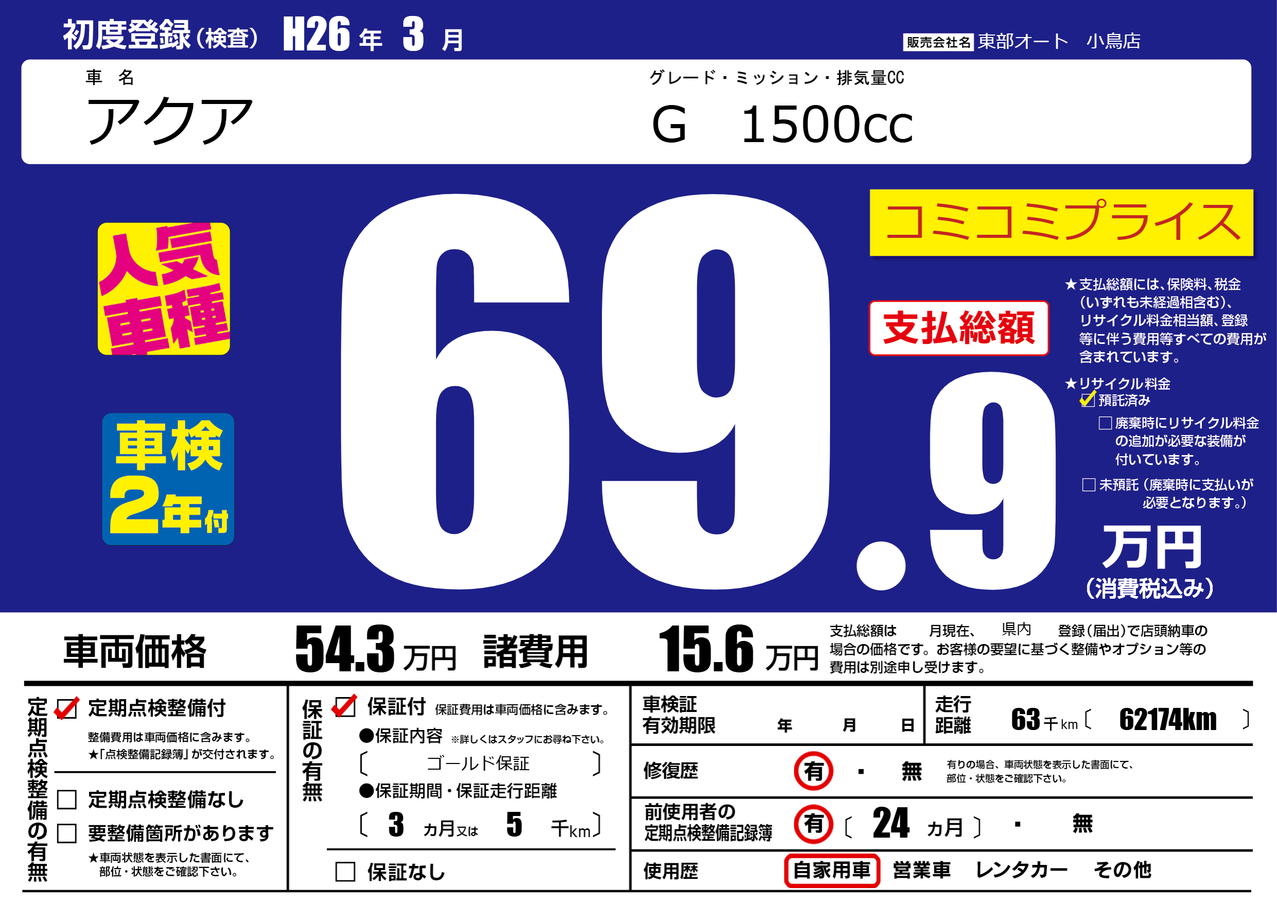 | 走行キロ | 6.3万km | 初年度登録 | H26年3月 |