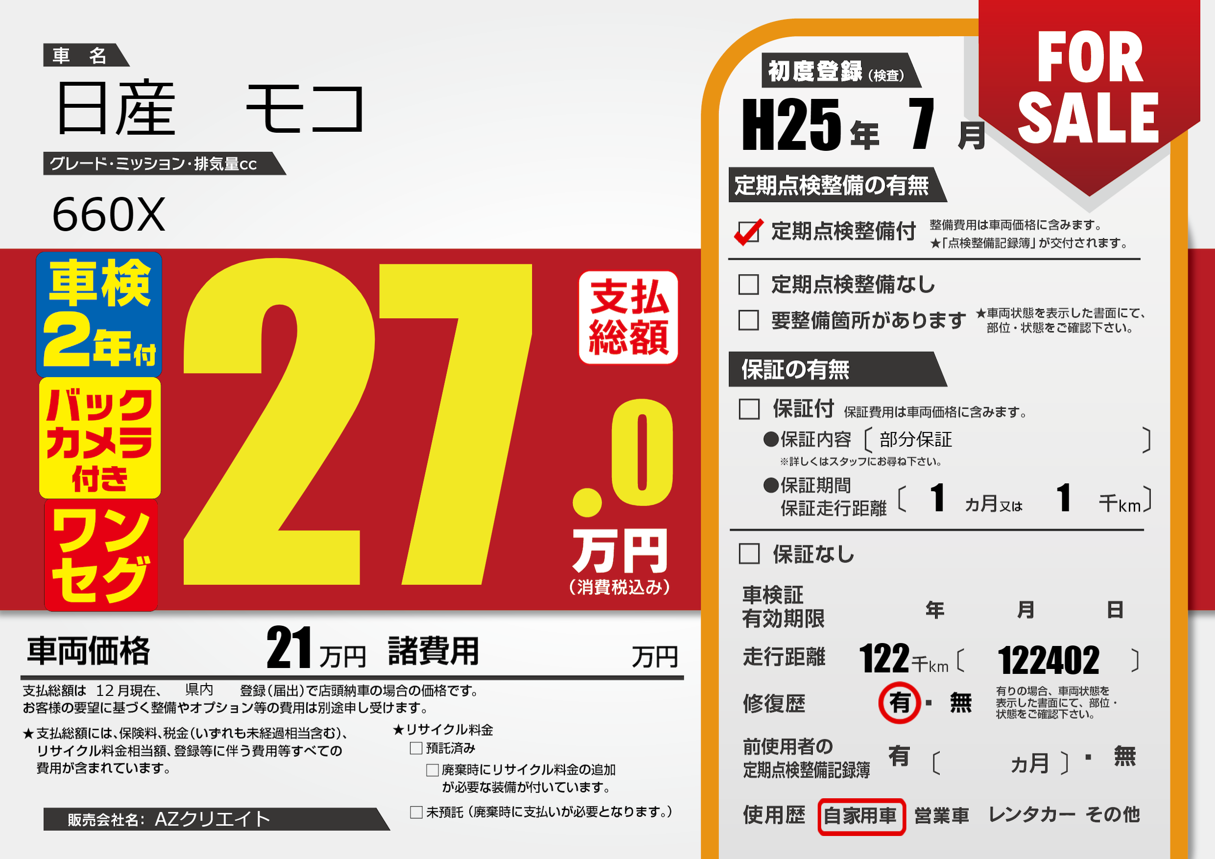| 車名 | 日産 モコ | グレード ミッション 排気量 |