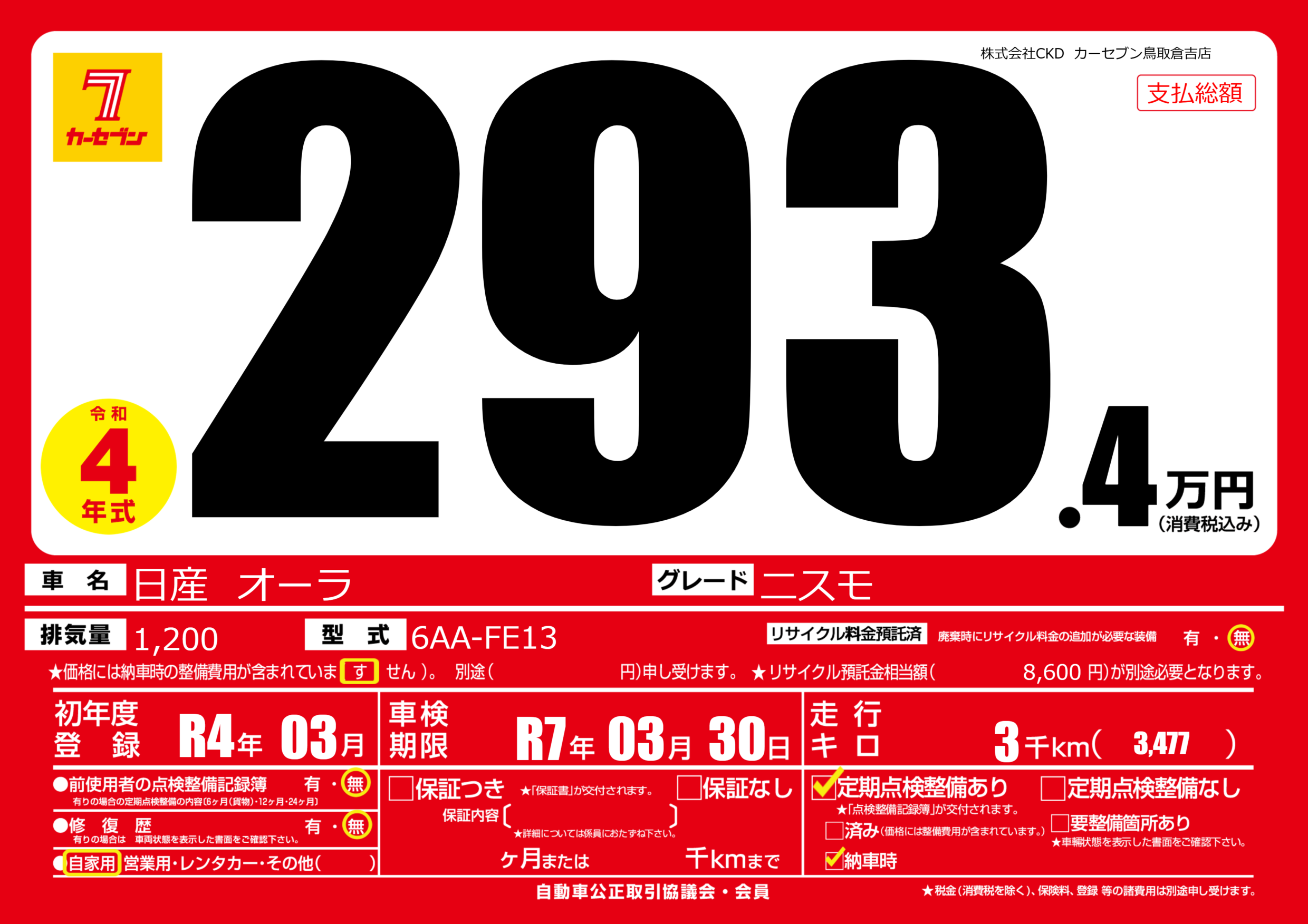 | 車名 | 日産 オーラ | グレード ミッション 排気量 |