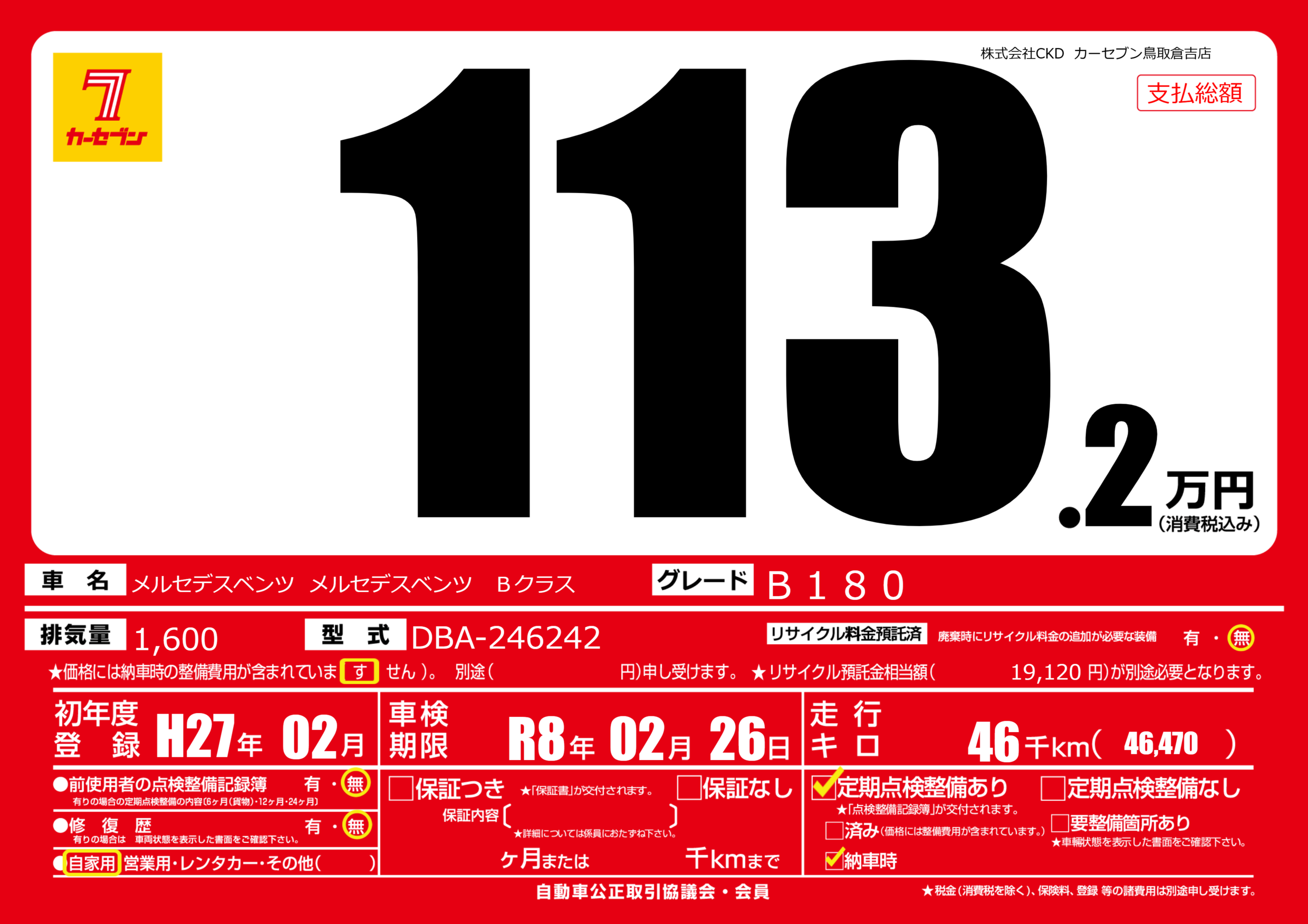 | 車名 | メルセデスベンツ メルセデスベンツ Bクラス | グレード ミッション 排気量 |