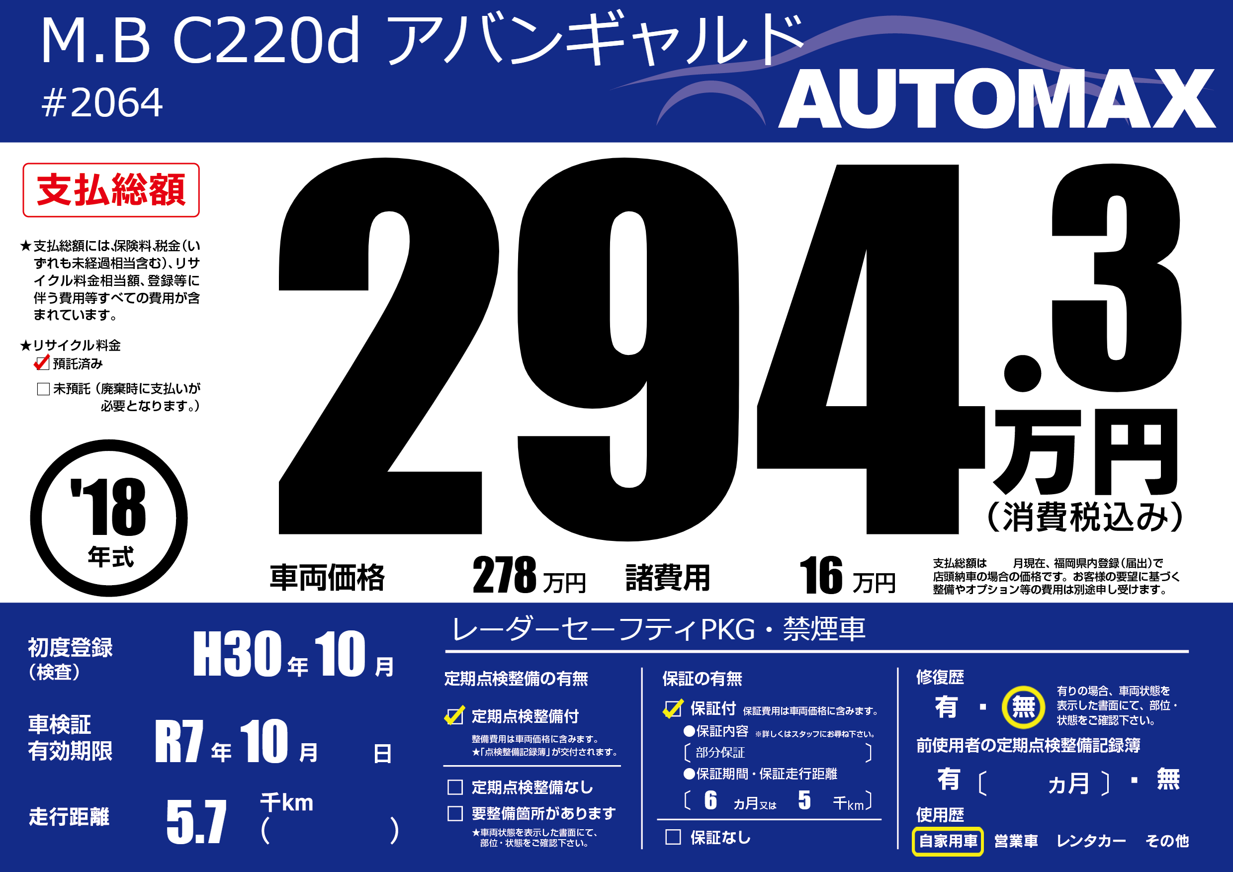 | 車名 | M.B C220d アバンギャルド | グレード ミッション 排気量 |