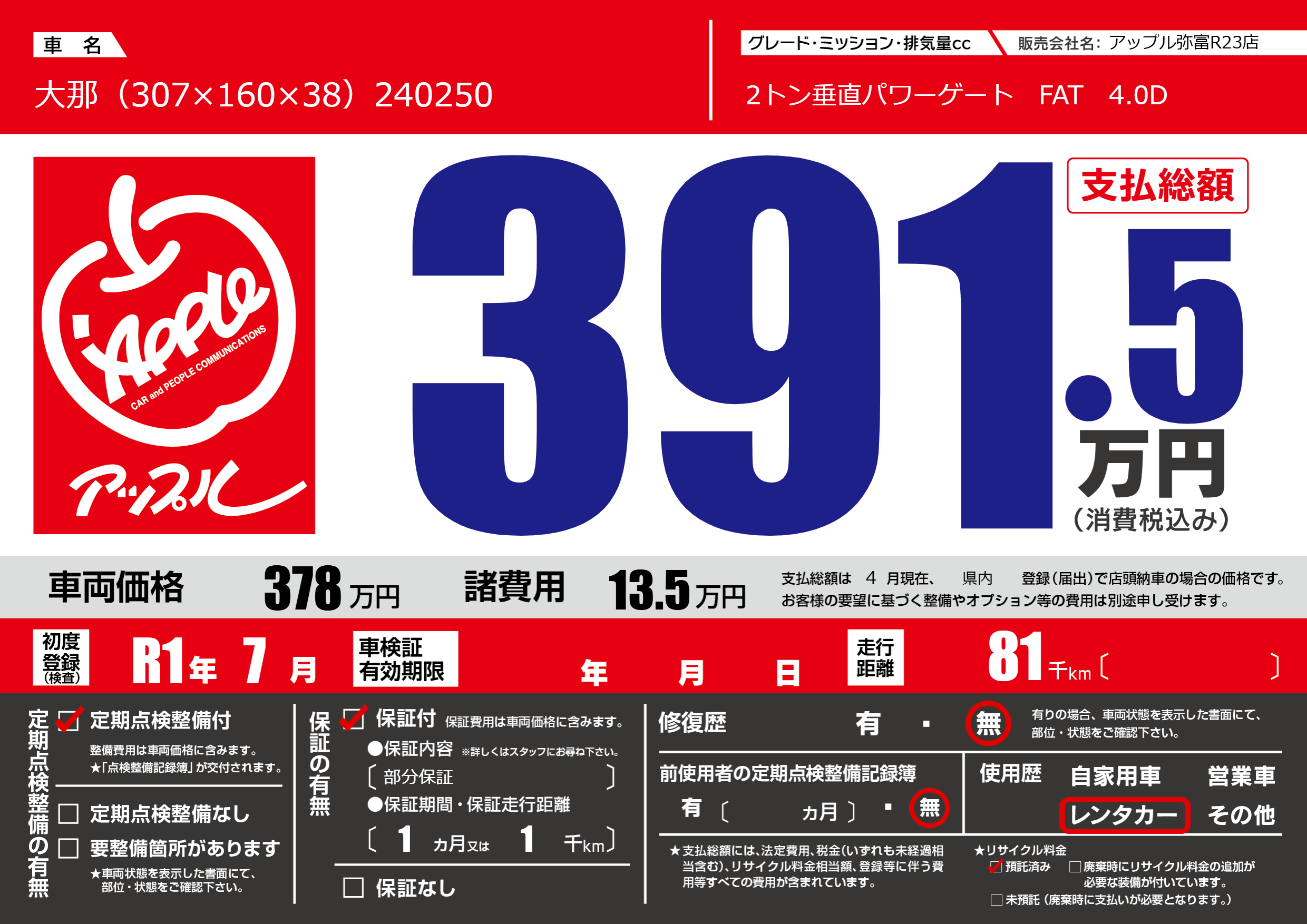 | 車名 | 大那(307×160×38)240250 | グレード ミッション 排気量 |
