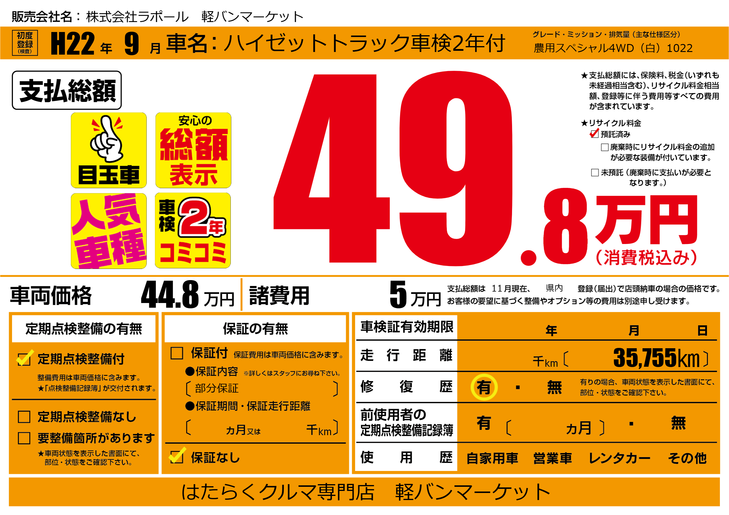 | 車名 | ハイゼットトラック車検2年付 | グレード ミッション 排気量 |