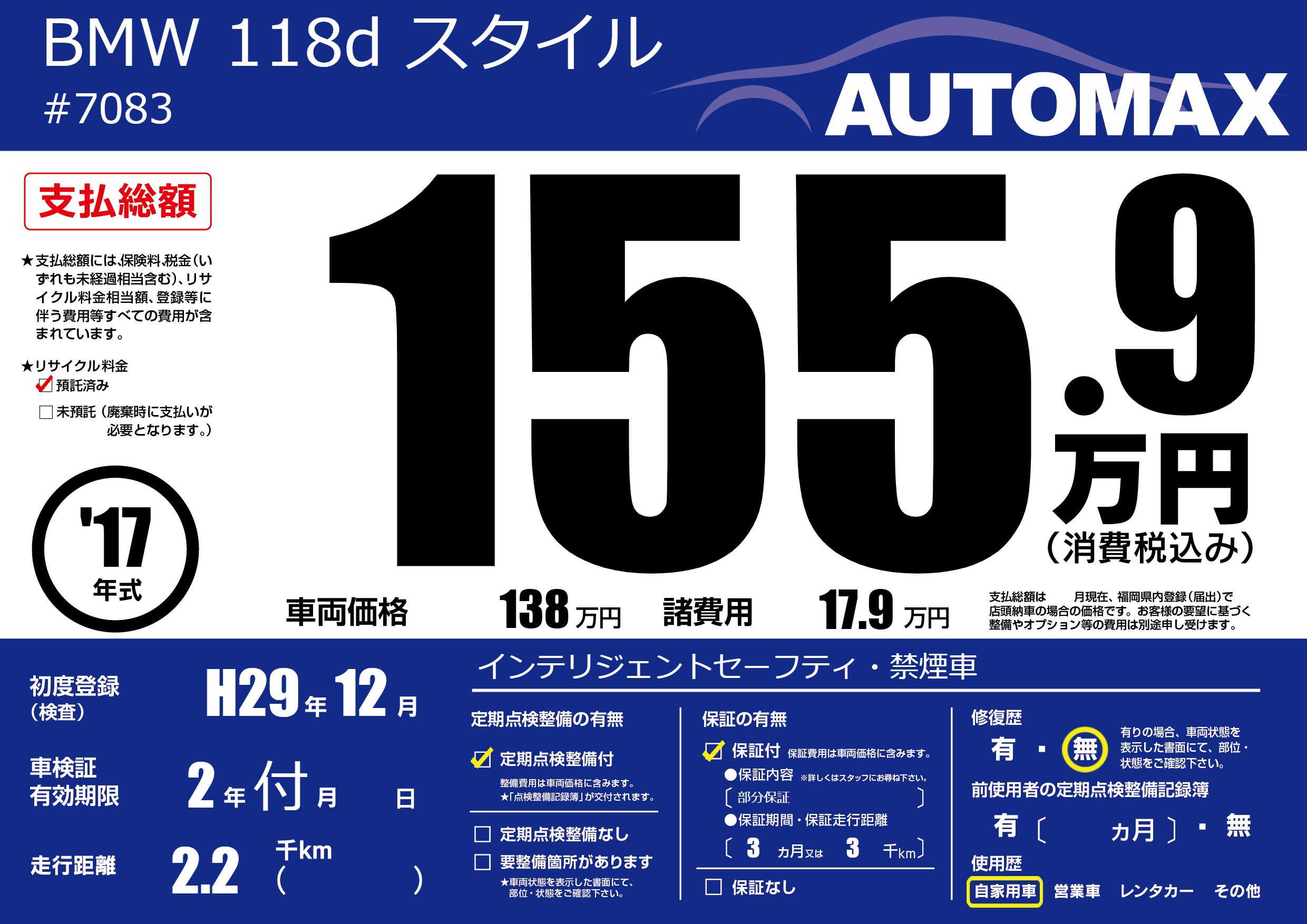 | 車名 | BMW 118d スタイル | グレード ミッション 排気量 |