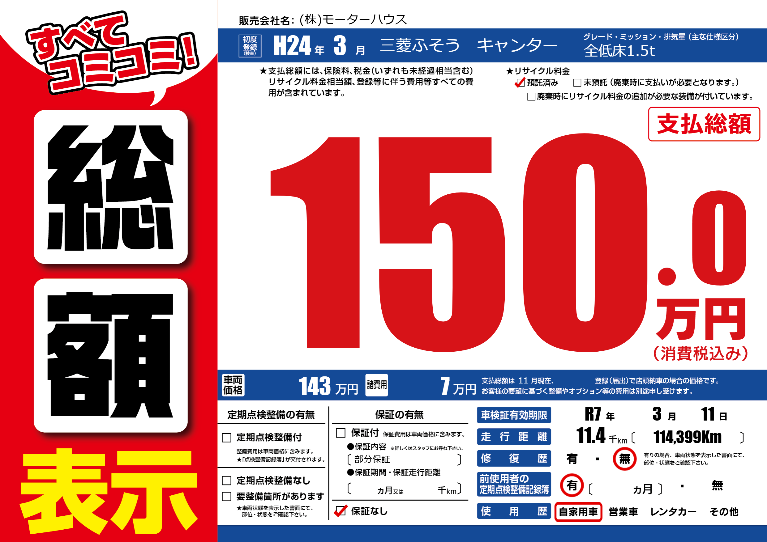 | 走行キロ | 1.1万km | 初年度登録 | H24年3月 |