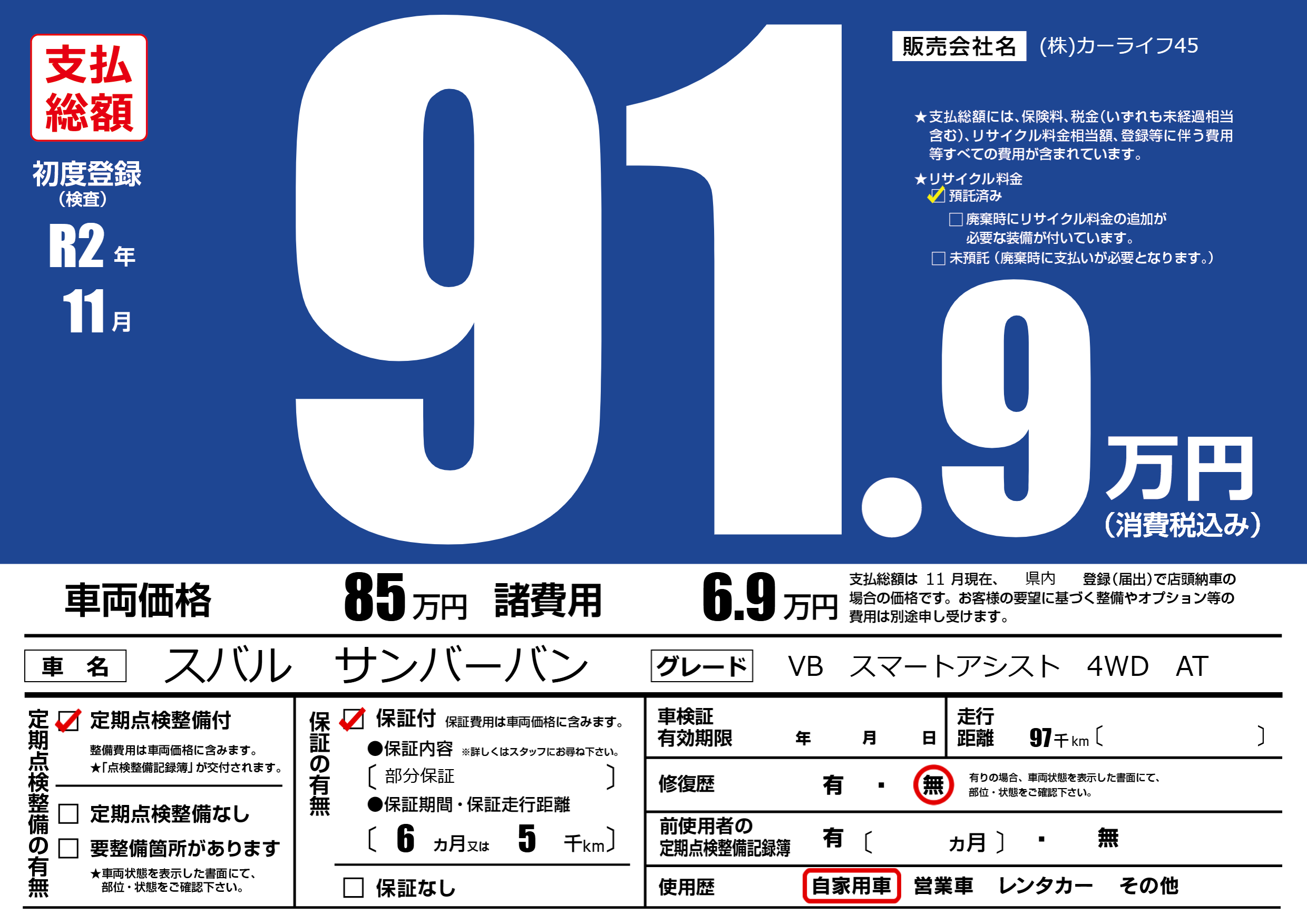 | 車名 | スバル サンバーバン | グレード ミッション 排気量 |