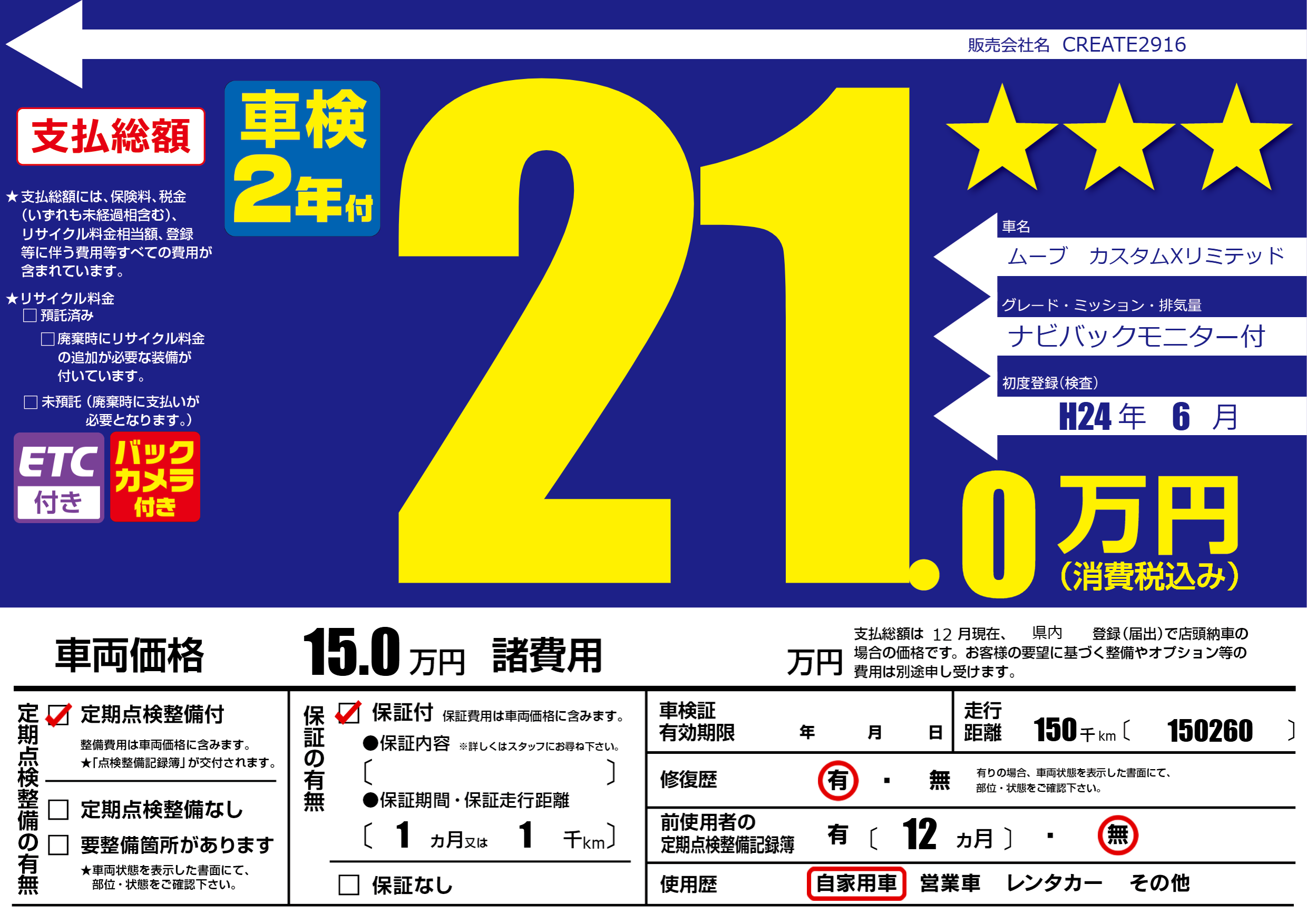 | 走行キロ | 15万km | 初年度登録 | H24年6月 |