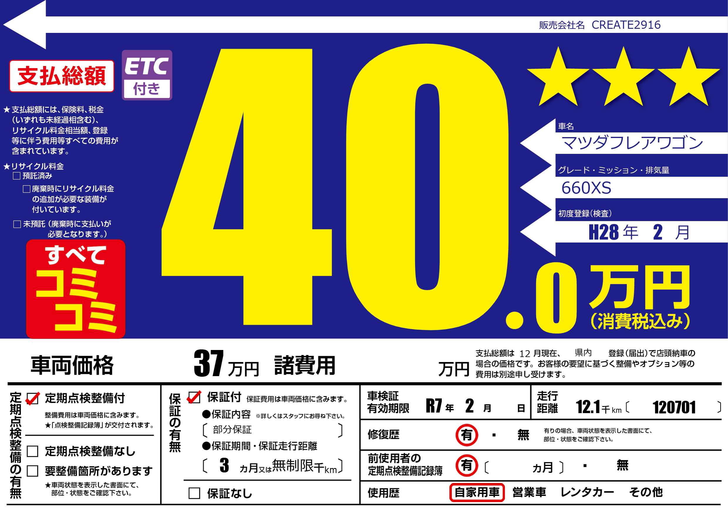 | 車名 | マツダフレアワゴン | グレード ミッション 排気量 |