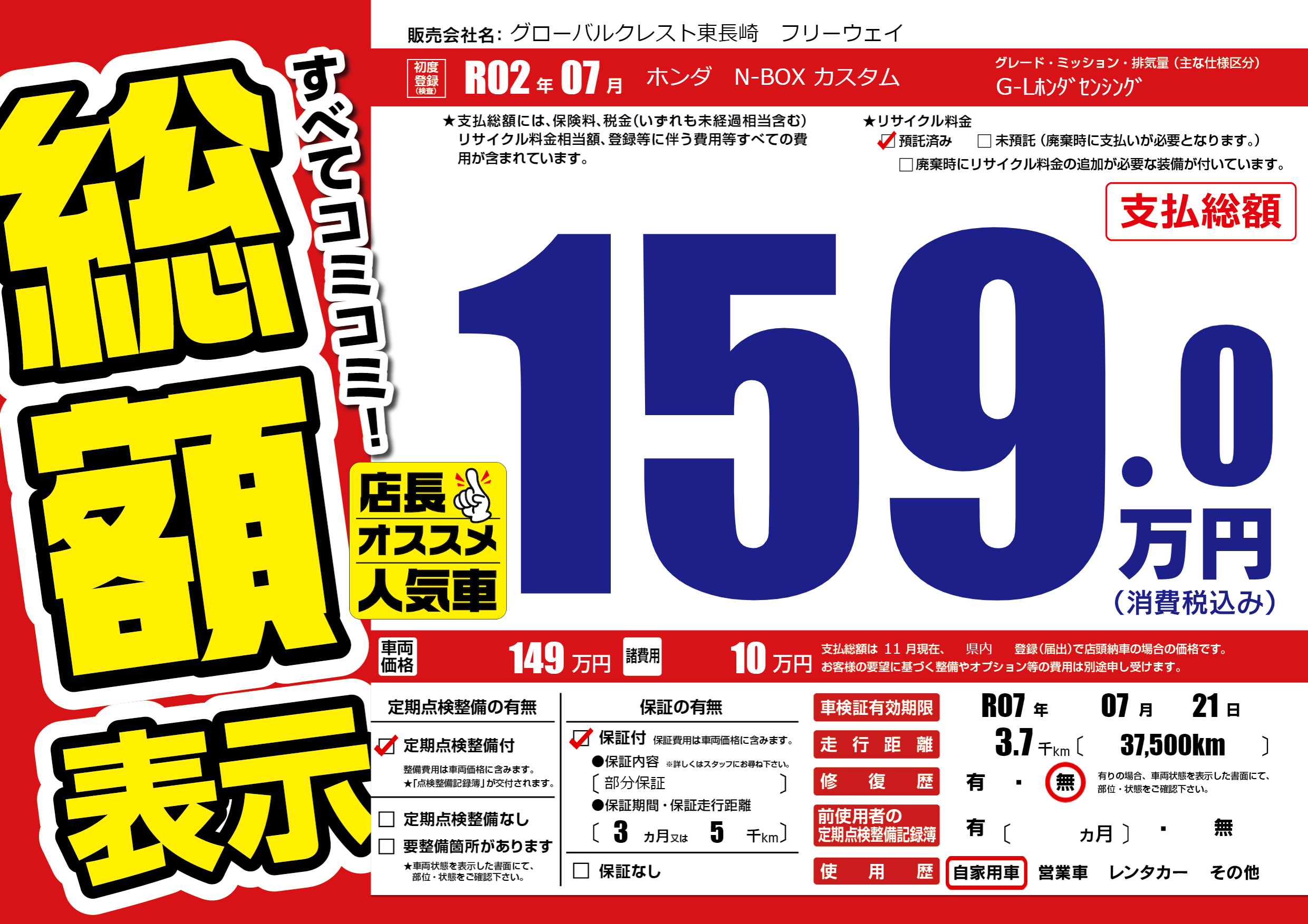 | 車名 | ホンダ N-BOX カスタム | グレード ミッション 排気量 |