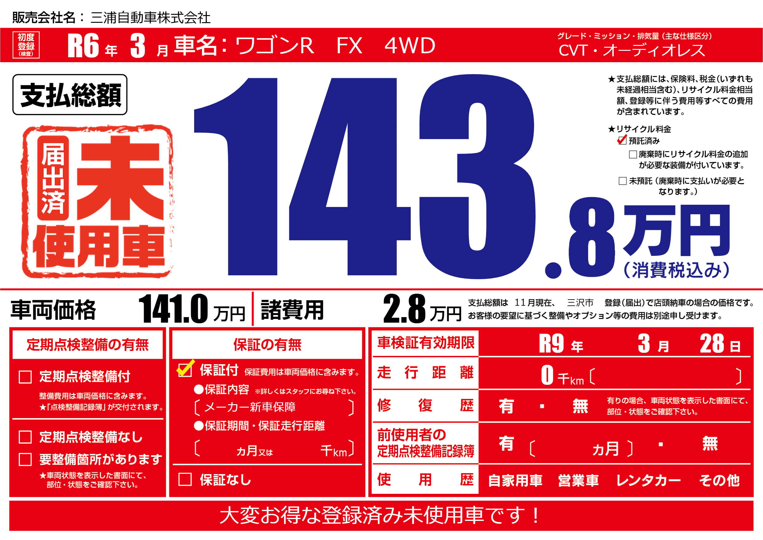| 車名 | ワゴンR FX 4WD | グレード ミッション 排気量 |