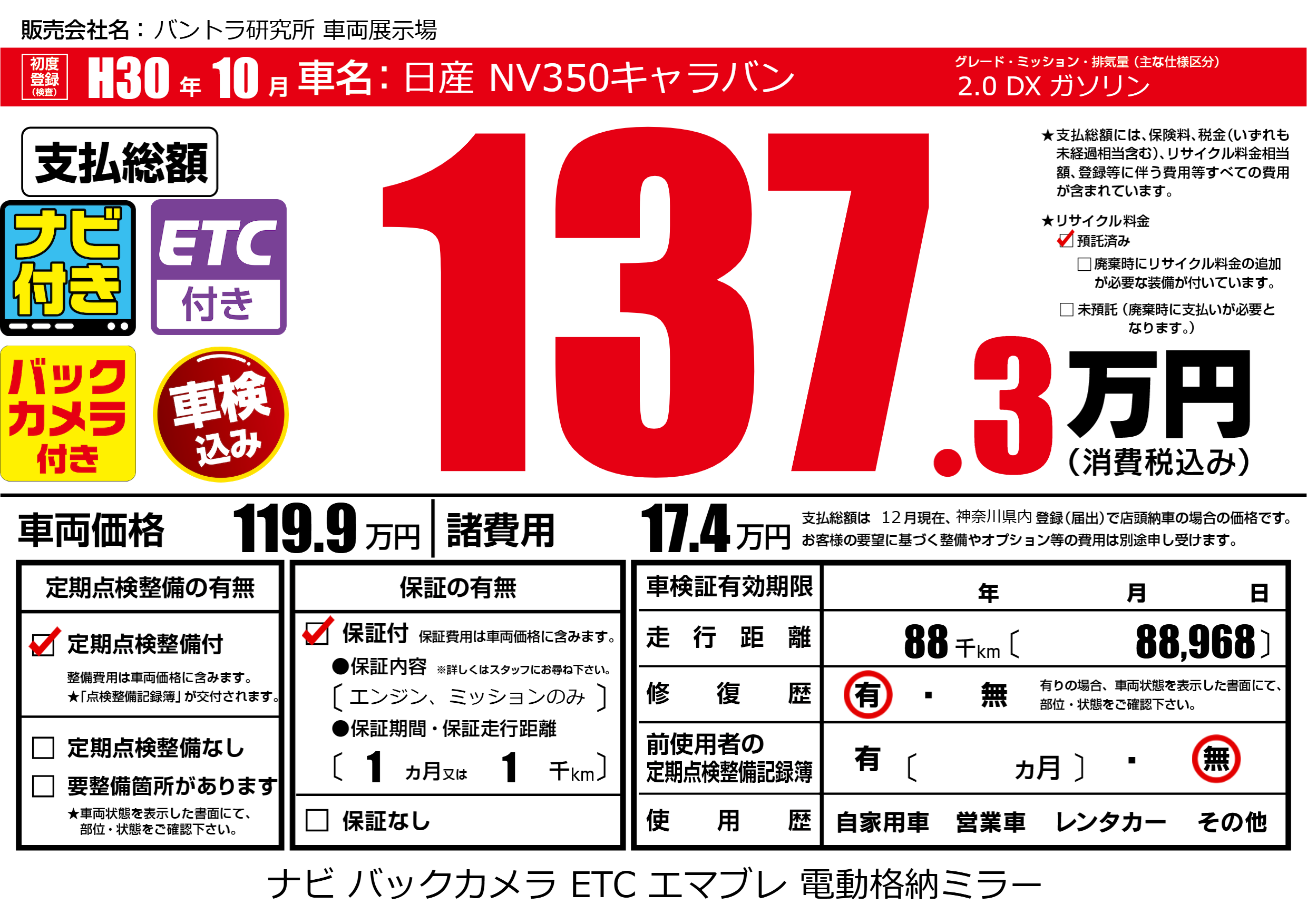 | 車名 | 日産 NV350キャラバン | グレード ミッション 排気量 |