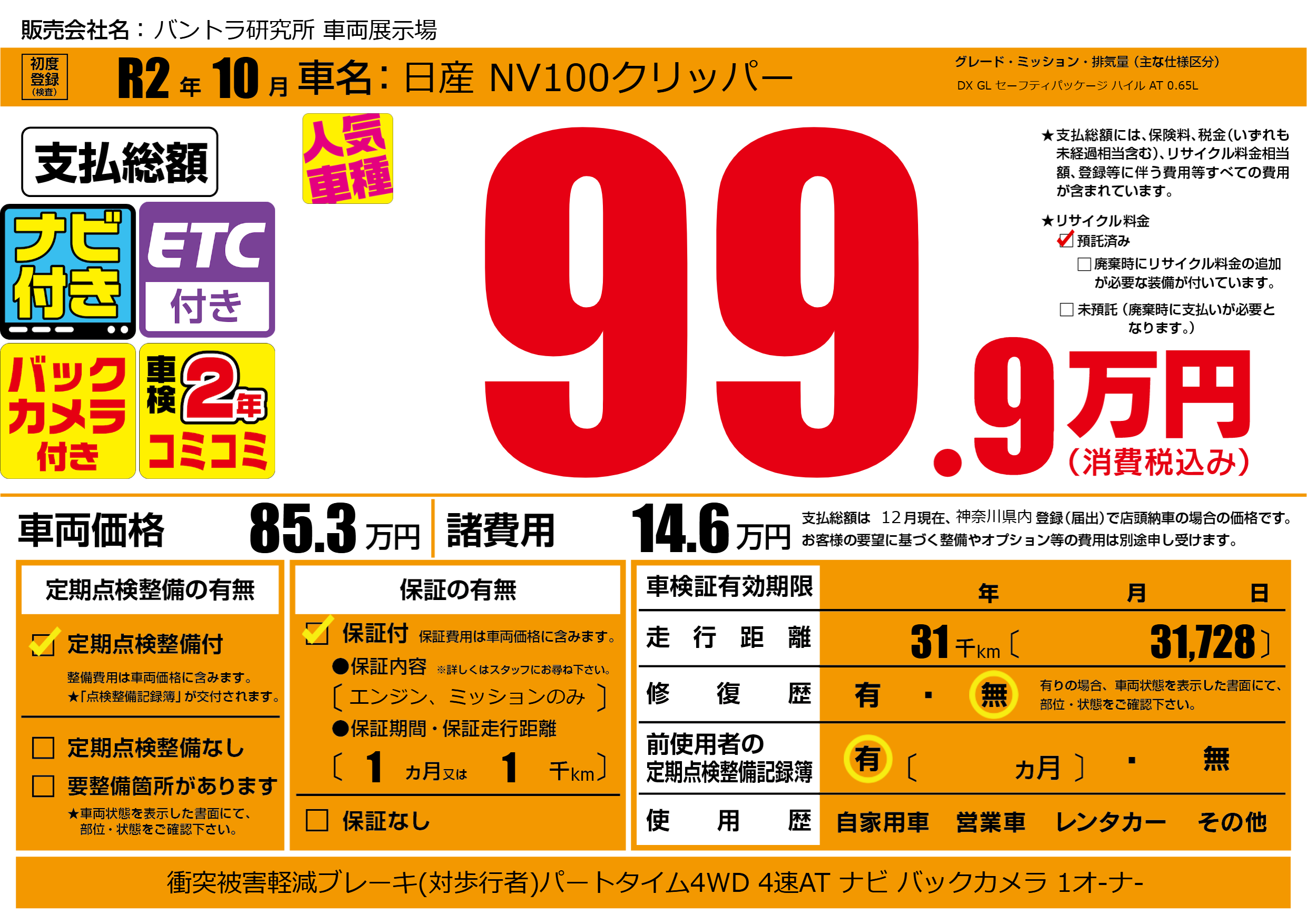 | 車名 | 日産 NV100クリッパー | グレード ミッション 排気量 |