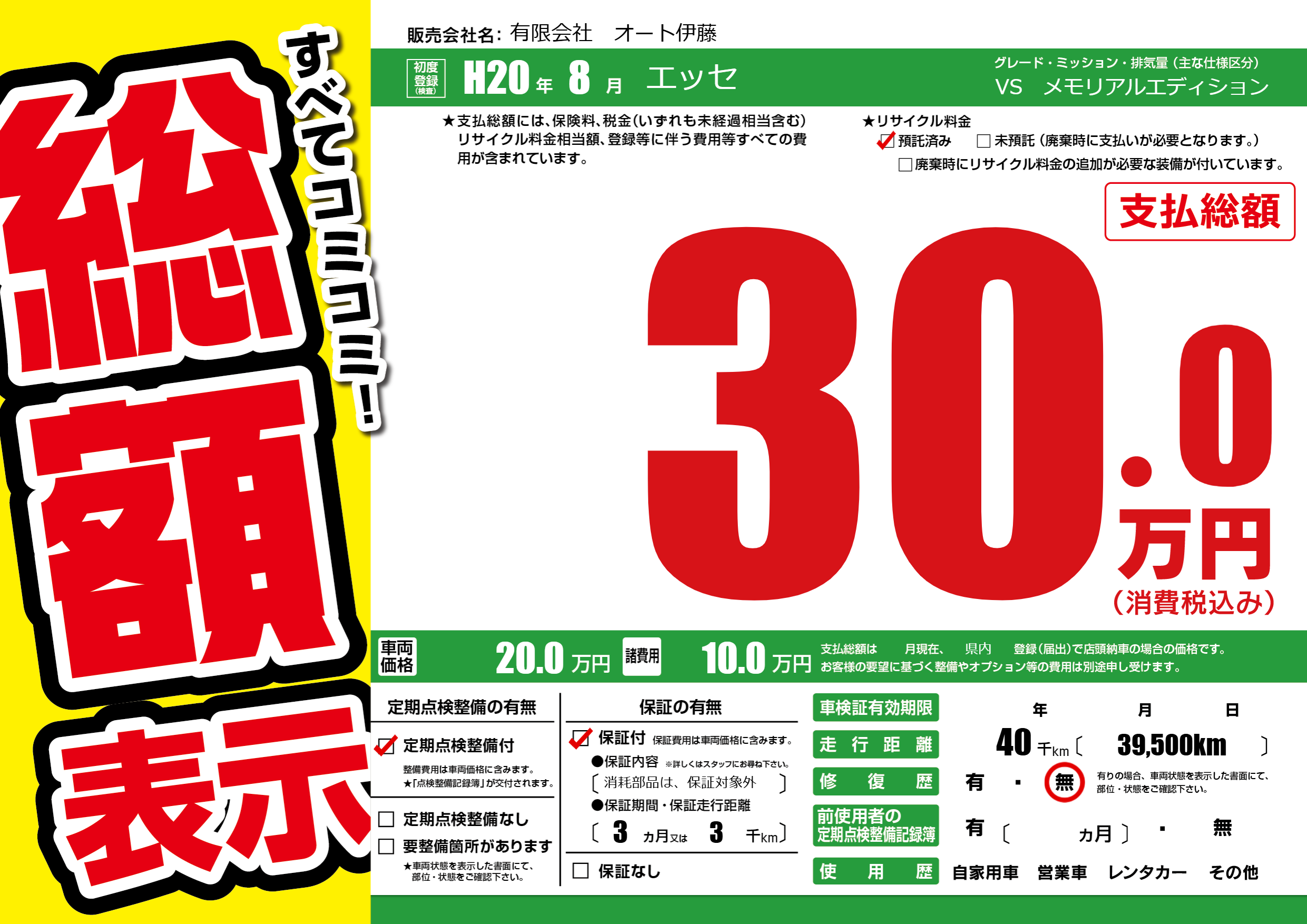 保証付き 保証内容(消耗部品は、保証対象外) 3ヶ月または(3)千kmまで |