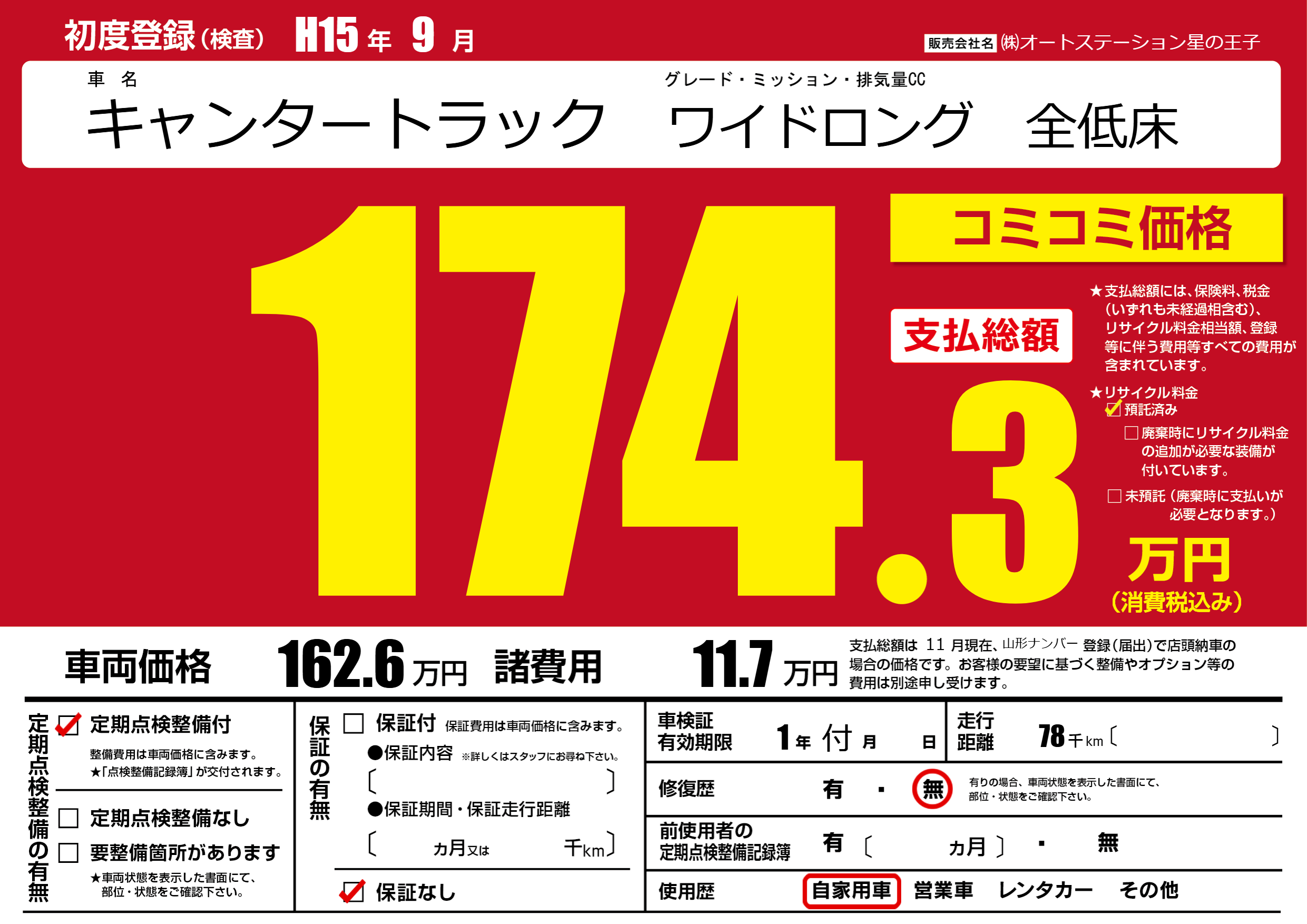 | 走行キロ | 7.8万km | 初年度登録 | H15年9月 |