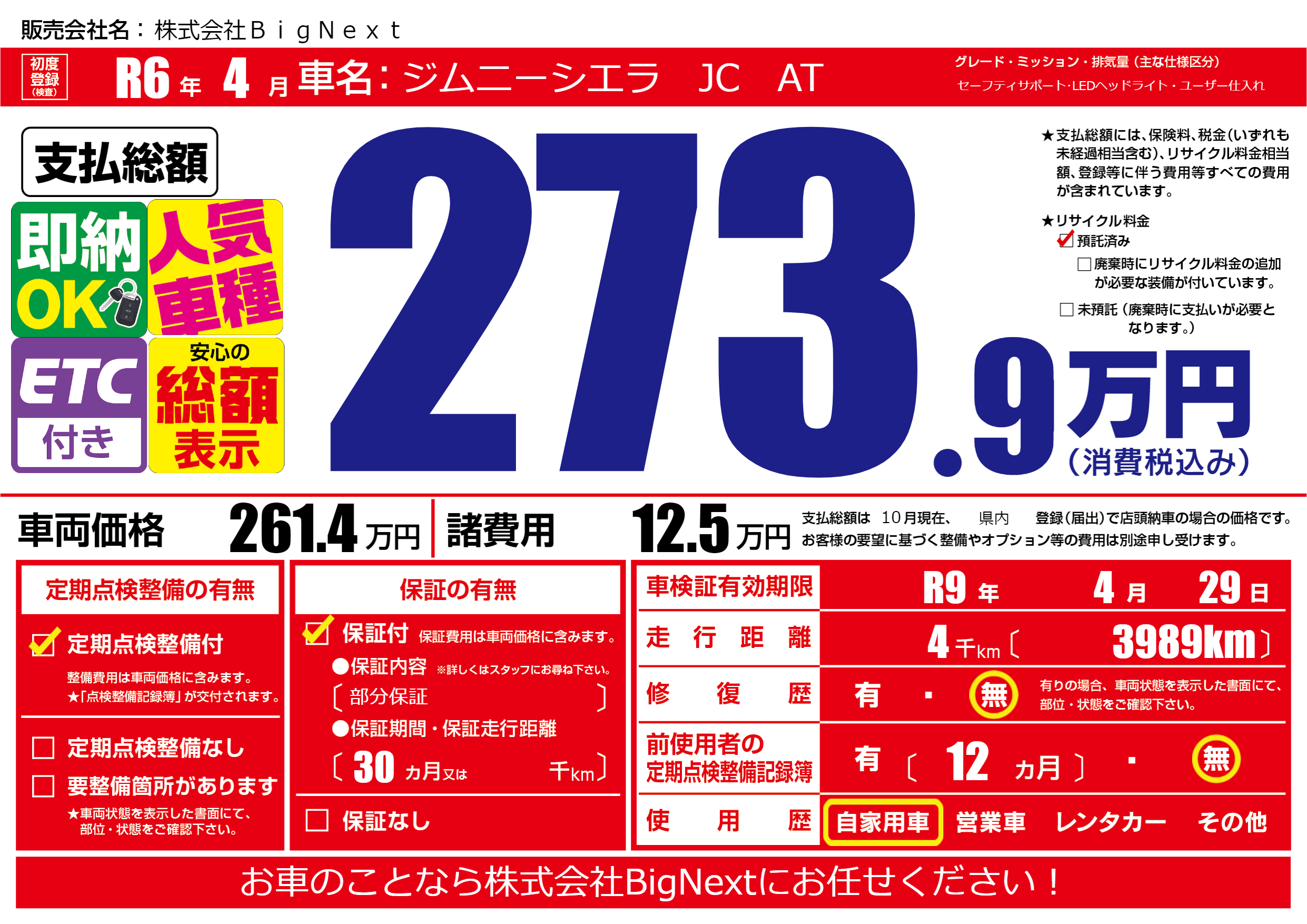 | 車名 | ジムニーシエラ JC AT | グレード ミッション 排気量 |