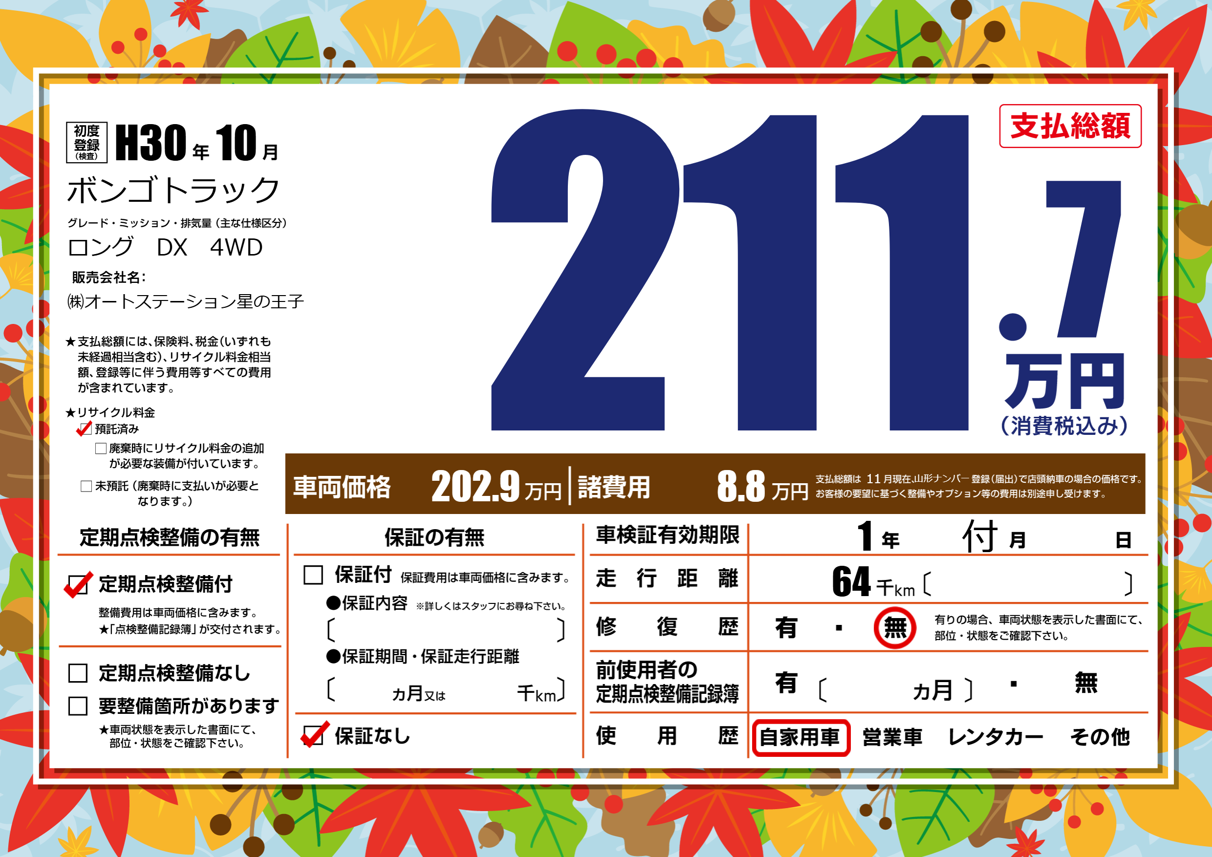 | 車名 | ボンゴトラック | グレード ミッション 排気量 |