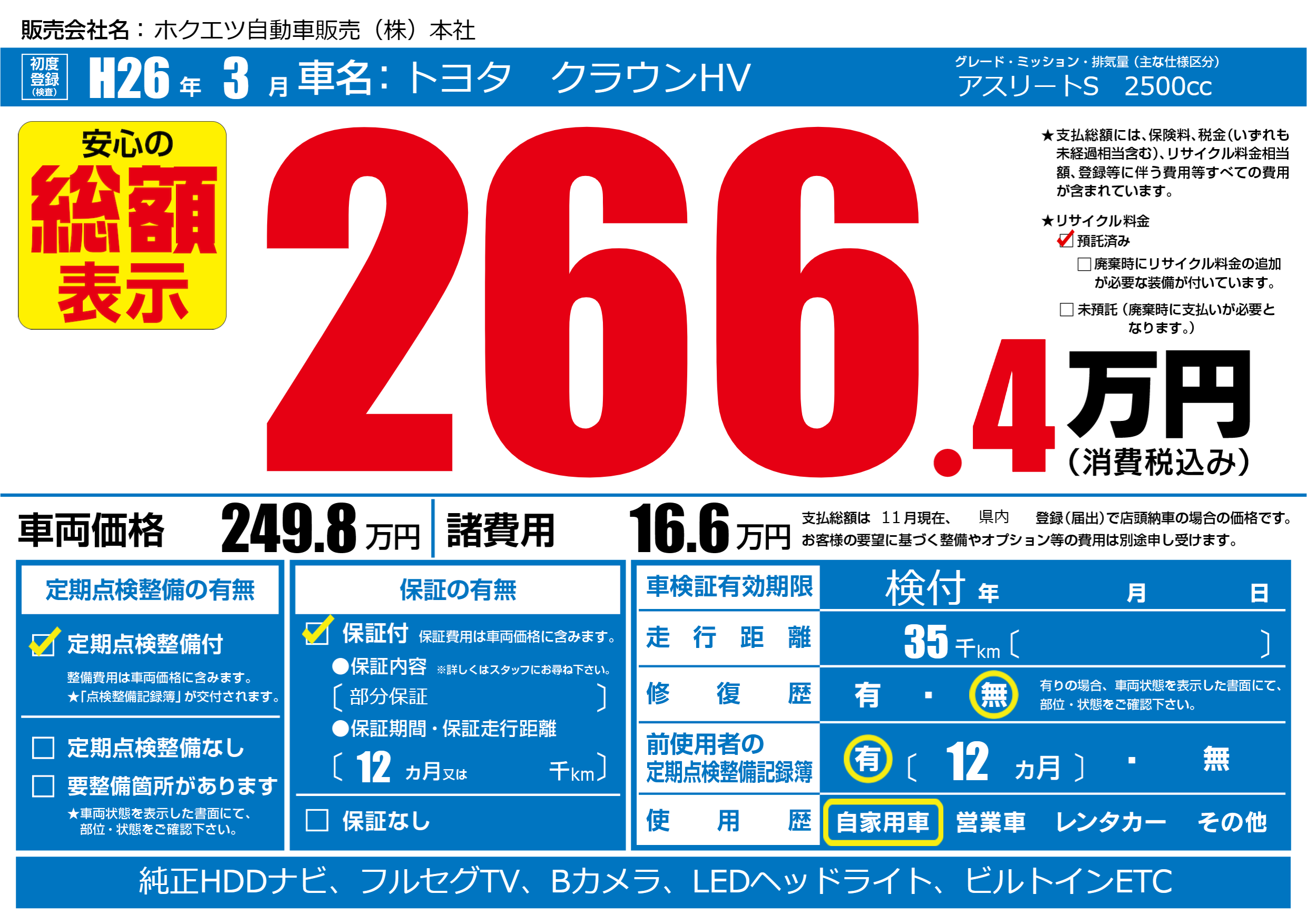 | 車名 | トヨタ クラウンHV | グレード ミッション 排気量 |