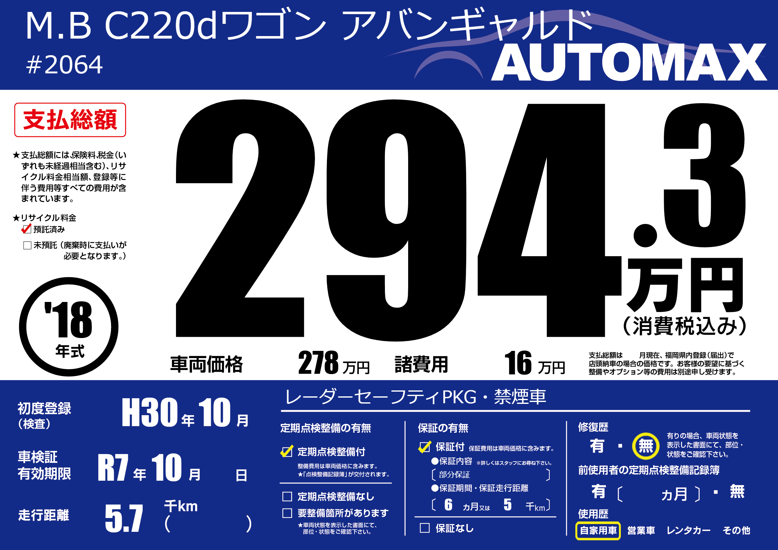 | 車名 | M.B C220dワゴン アバンギャルド | グレード ミッション 排気量 |