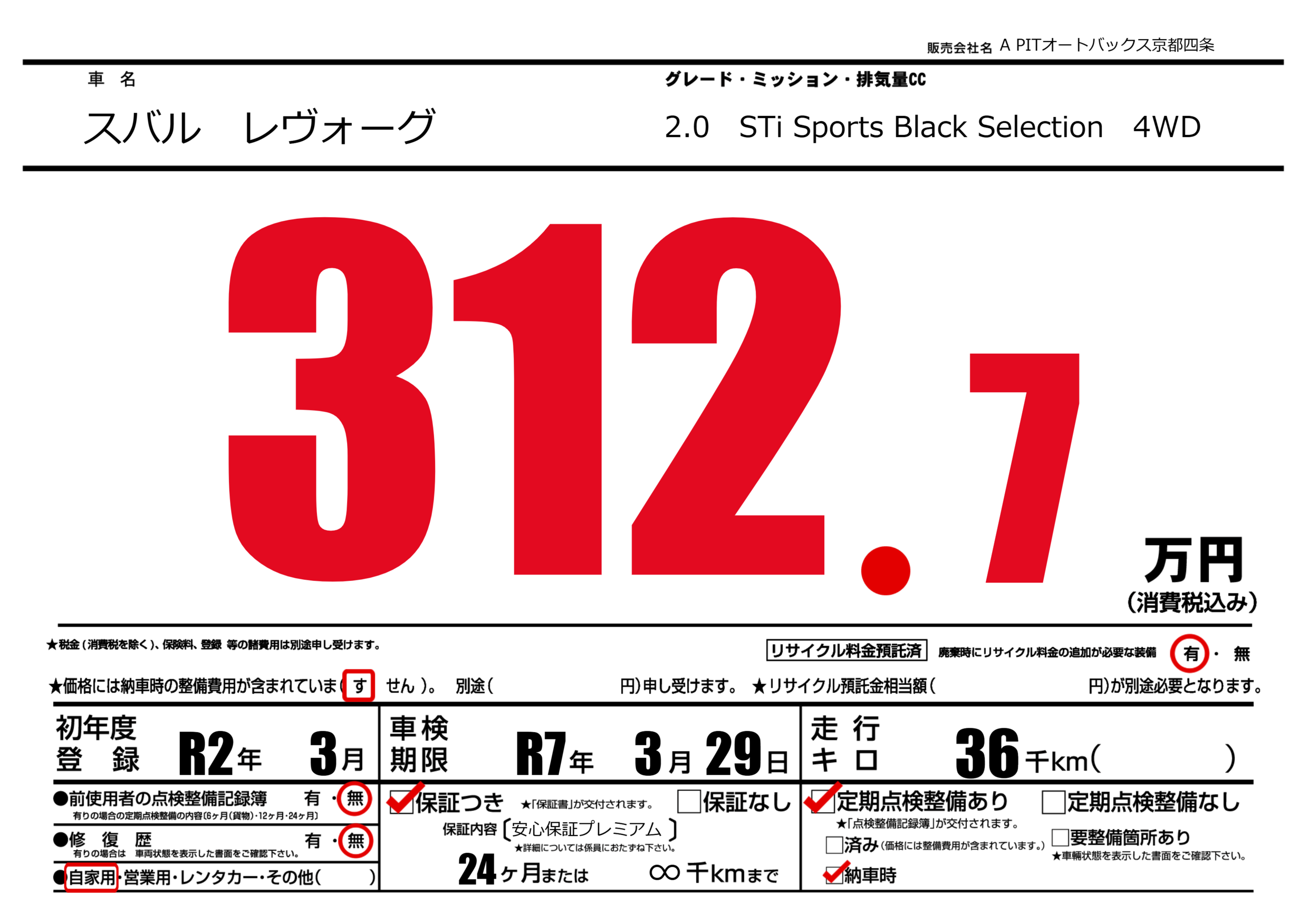 | 車名 | スバル レヴォーグ | グレード ミッション 排気量 |