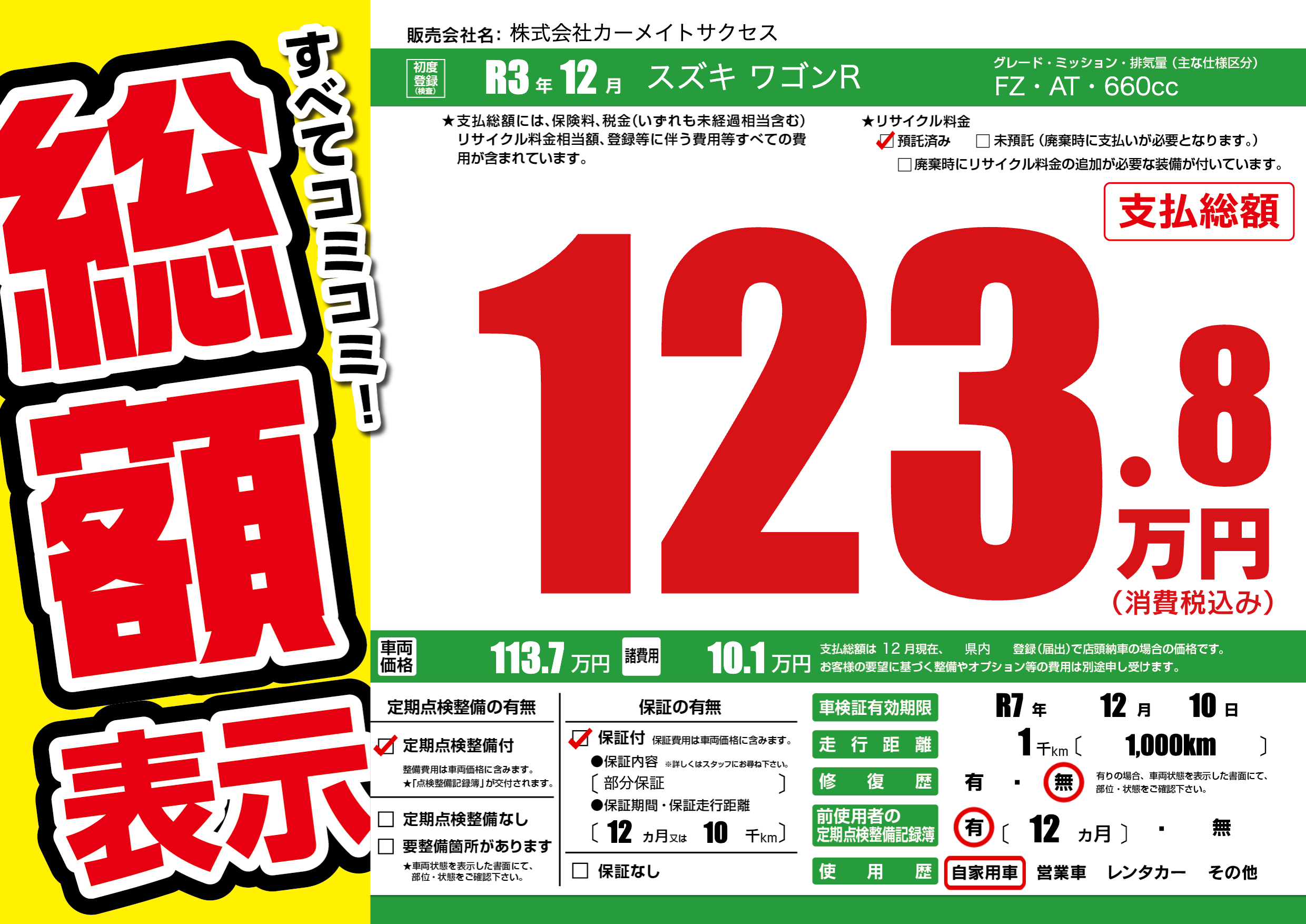 | 車名 | スズキ ワゴンR | グレード ミッション 排気量 |