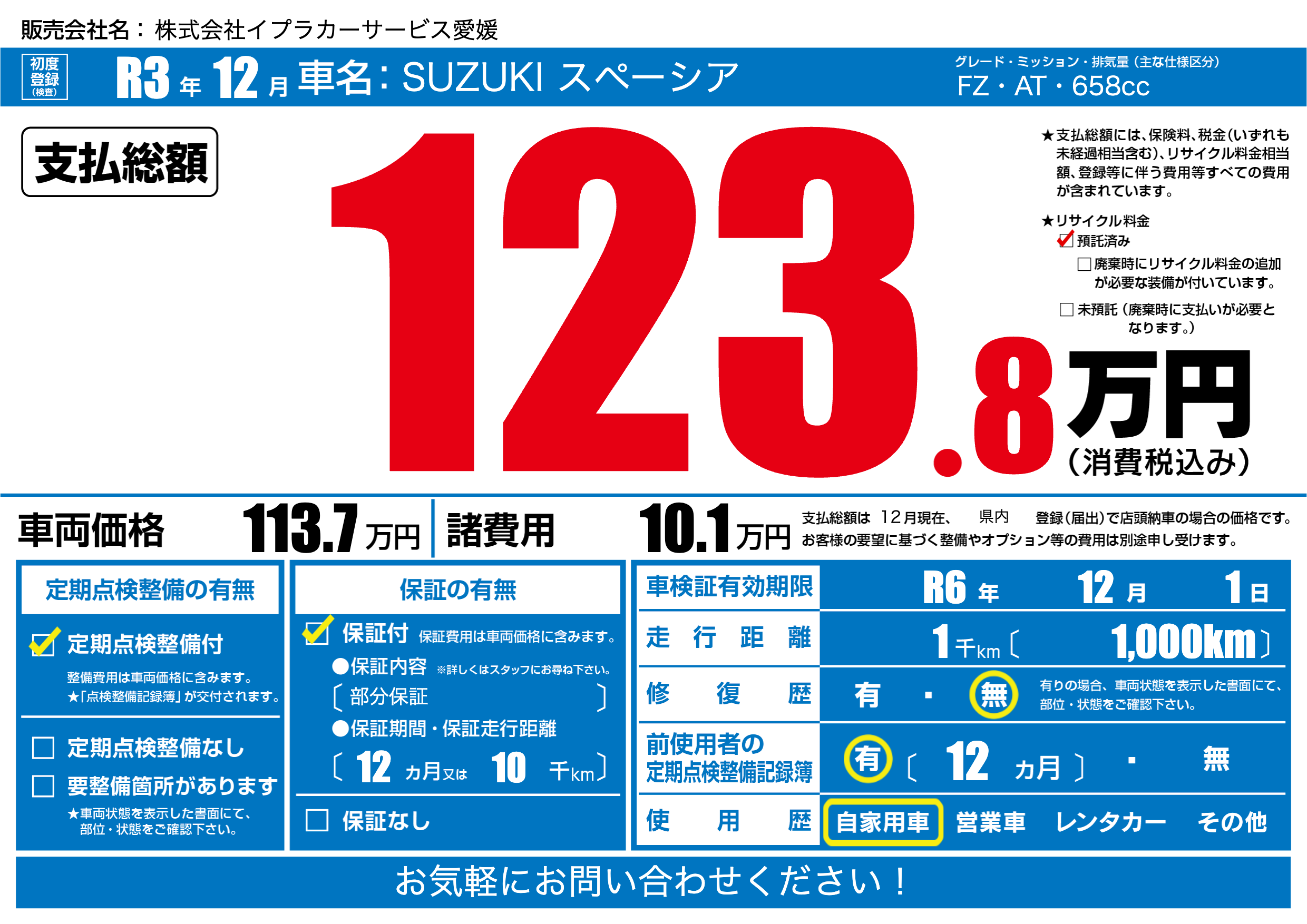 | 車名 | SUZUKI スペーシア | グレード ミッション 排気量 |