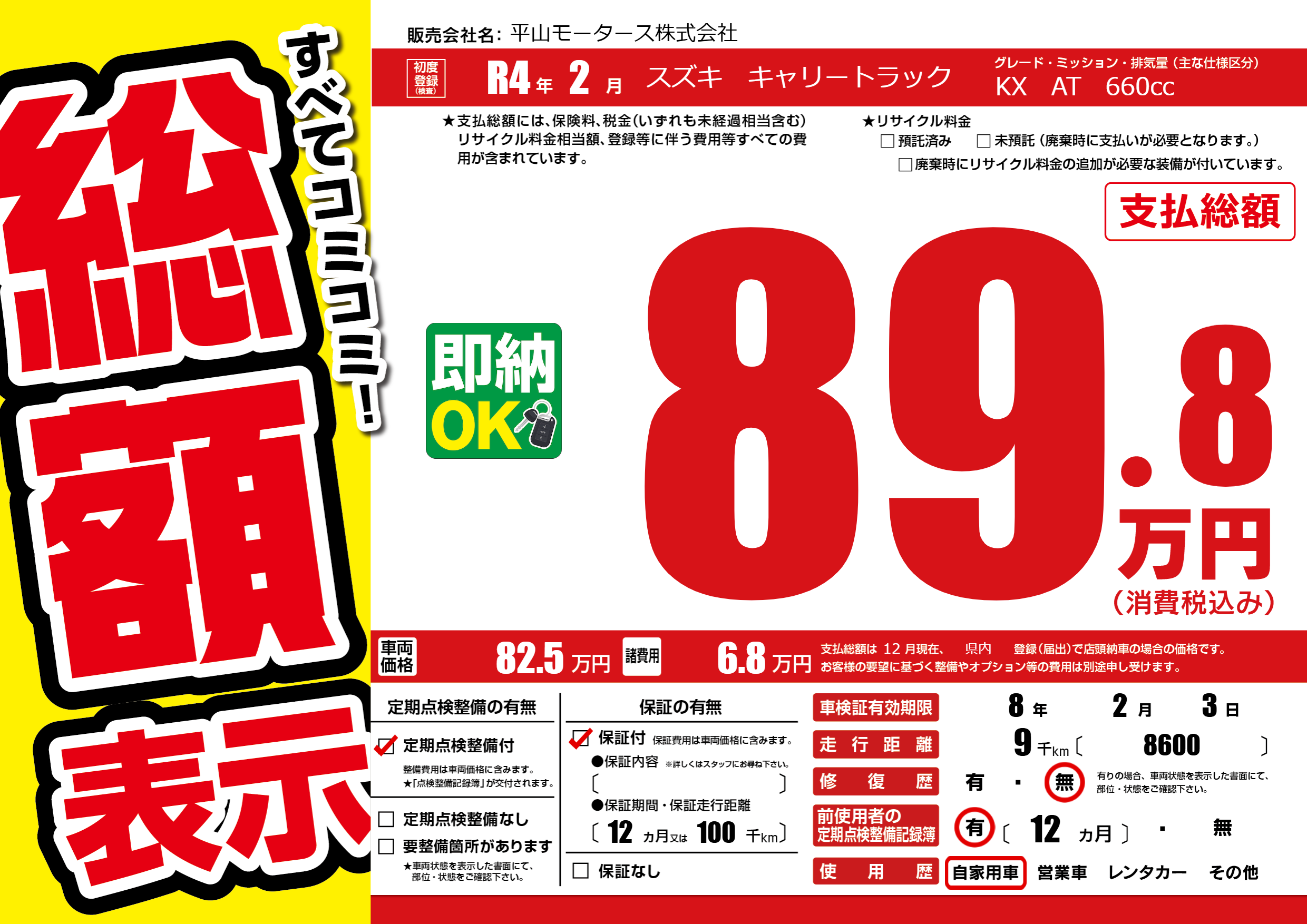 | 車名 | スズキ キャリートラック | グレード ミッション 排気量 |