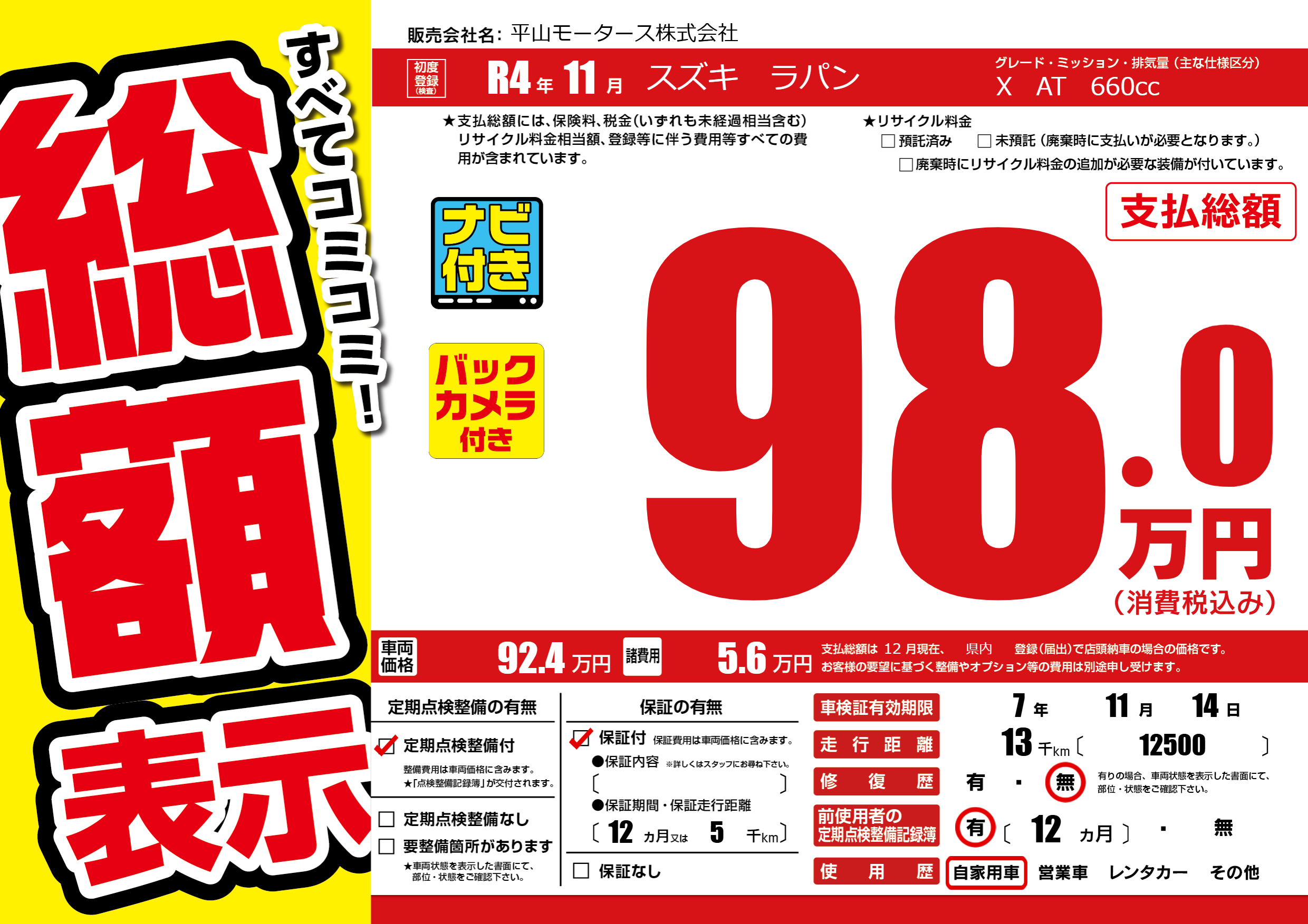 | 走行キロ | 1.3万km | 初年度登録 | R4年11月 |