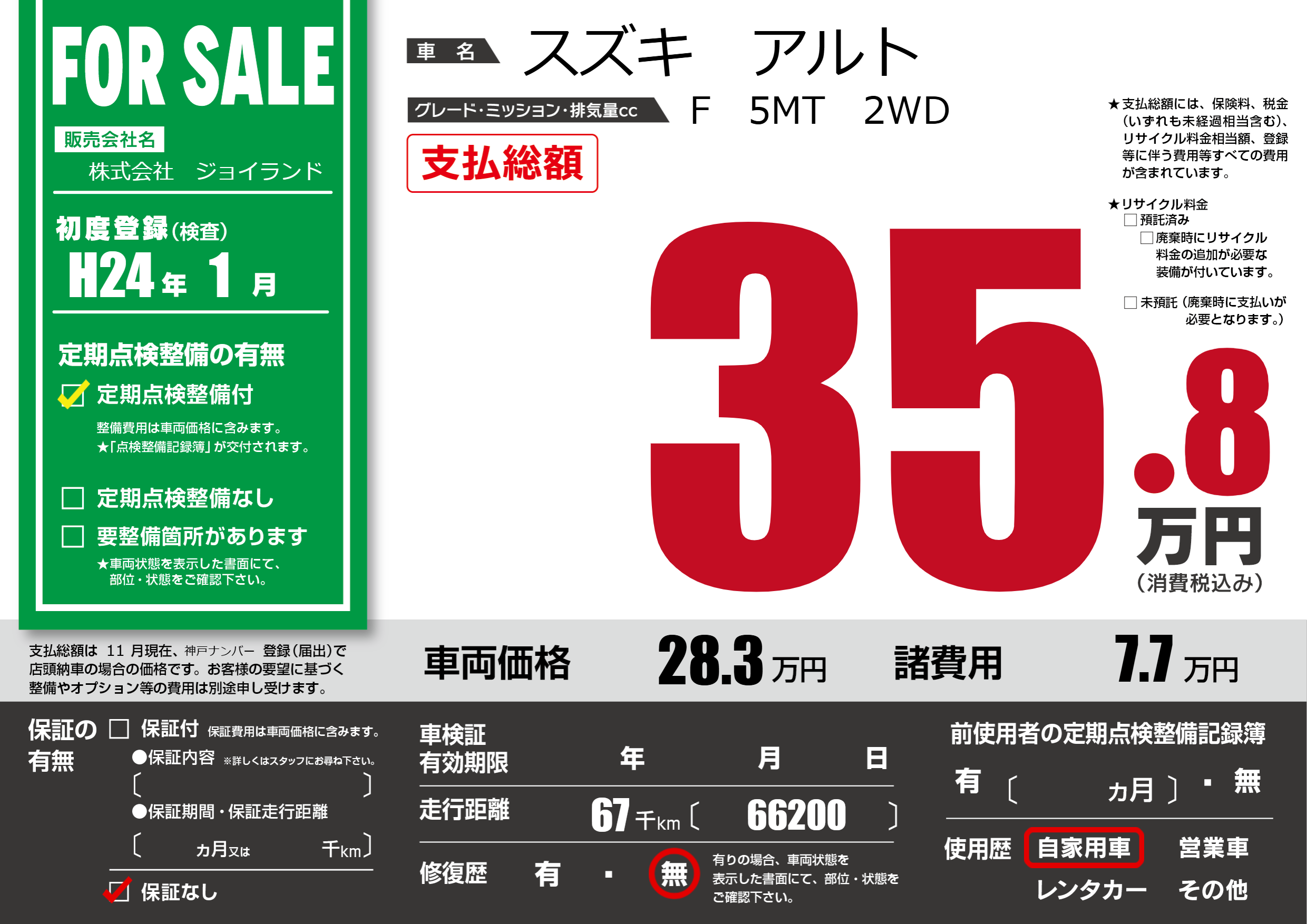 | 車名 | スズキ アルト | グレード ミッション 排気量 |