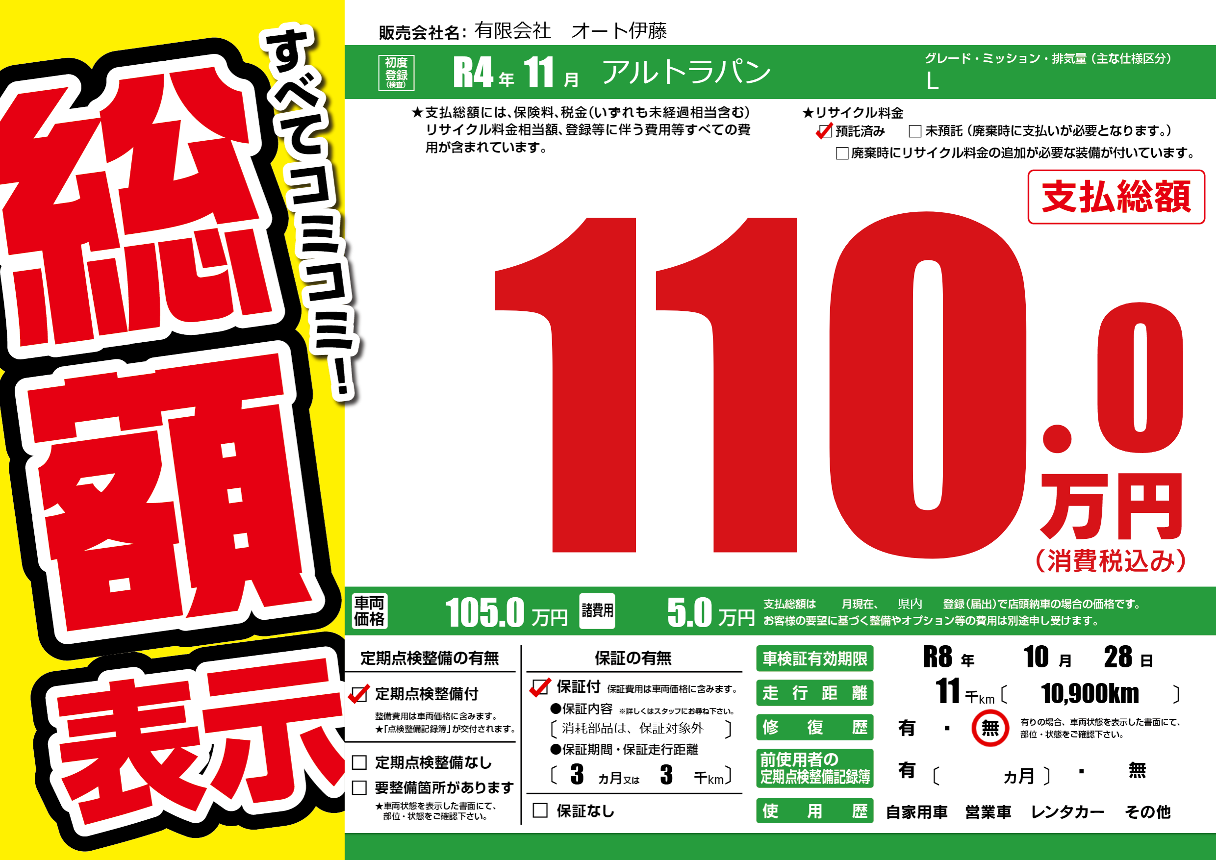 | 走行キロ | 1.1万km | 初年度登録 | R4年11月 |