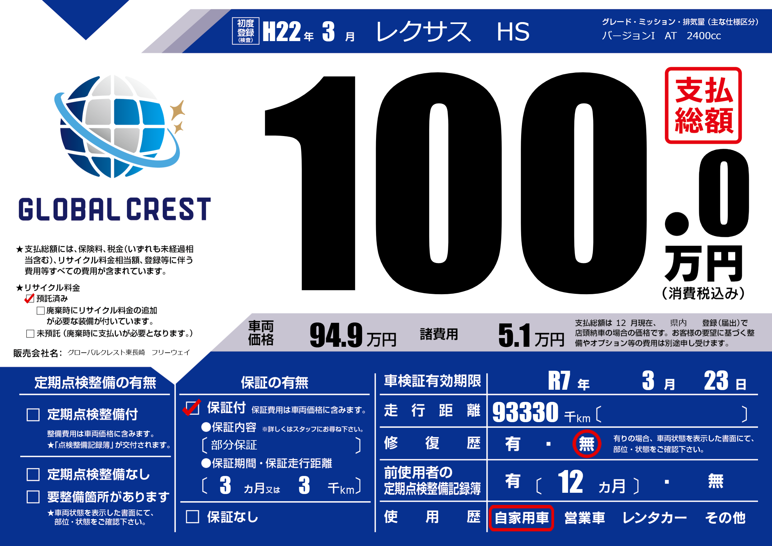 | 走行キロ | 9333万km | 初年度登録 | H22年3月 |