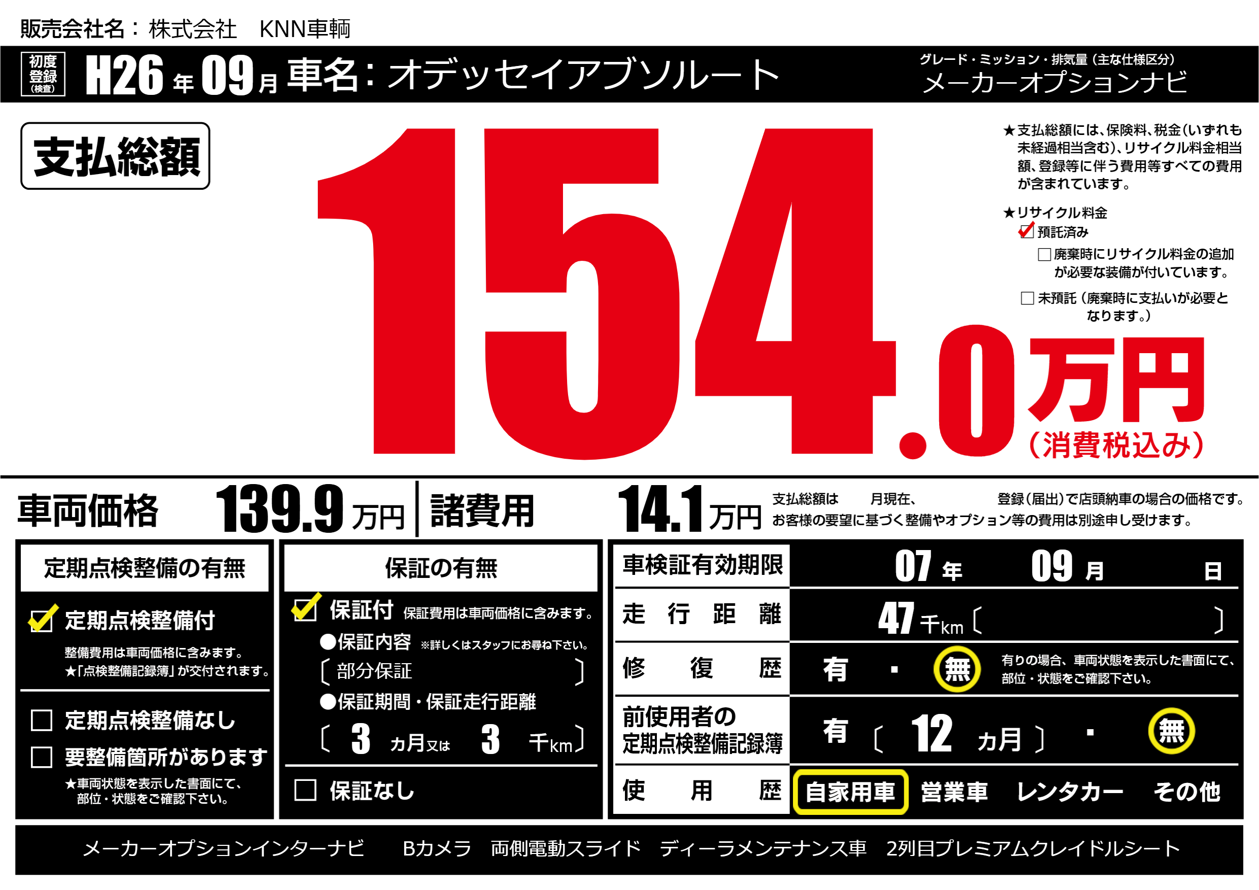 | 走行キロ | 4.7万km | 初年度登録 | H26年09月 |