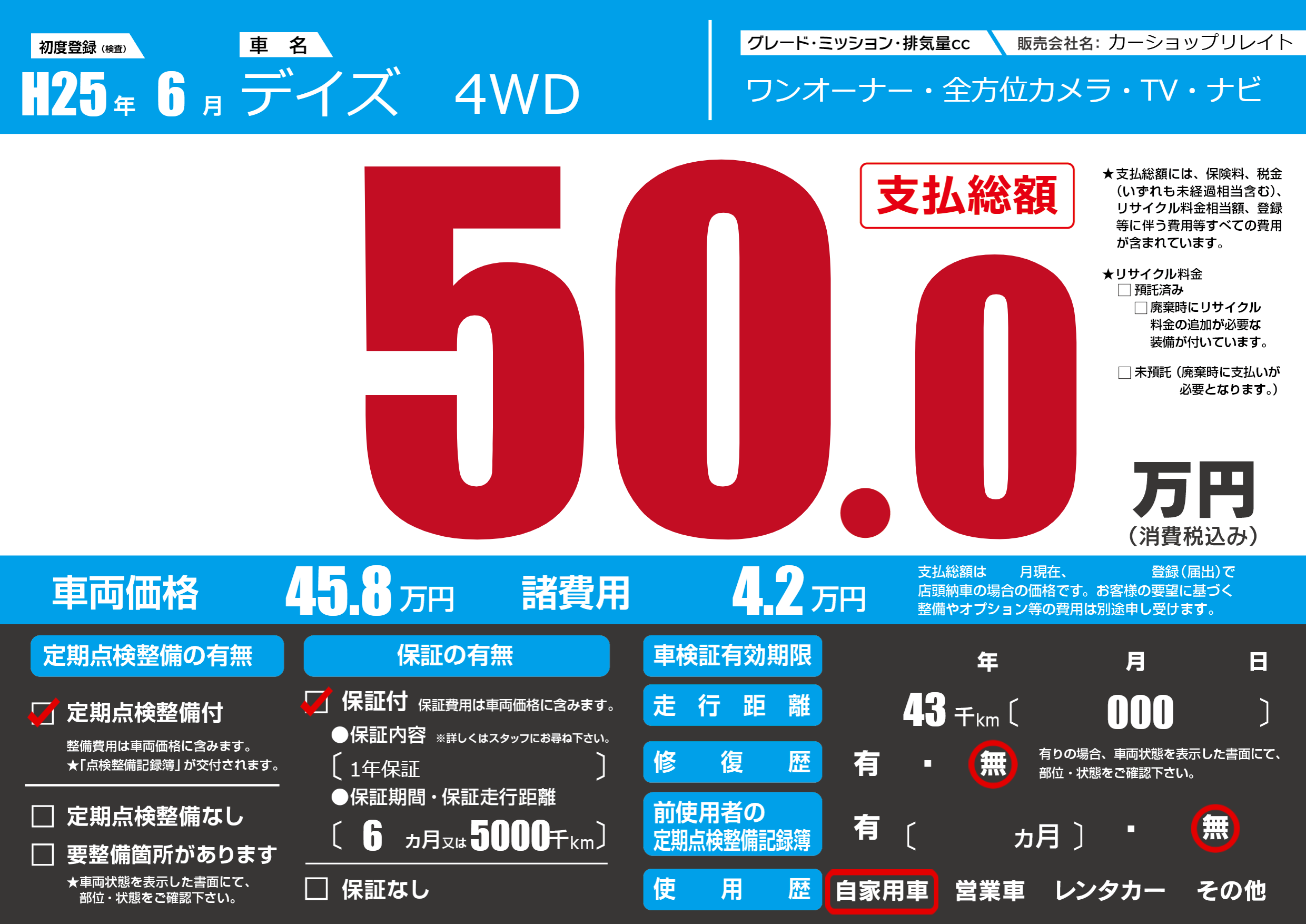 | 走行キロ | 4.3万km | 初年度登録 | H25年6月 |