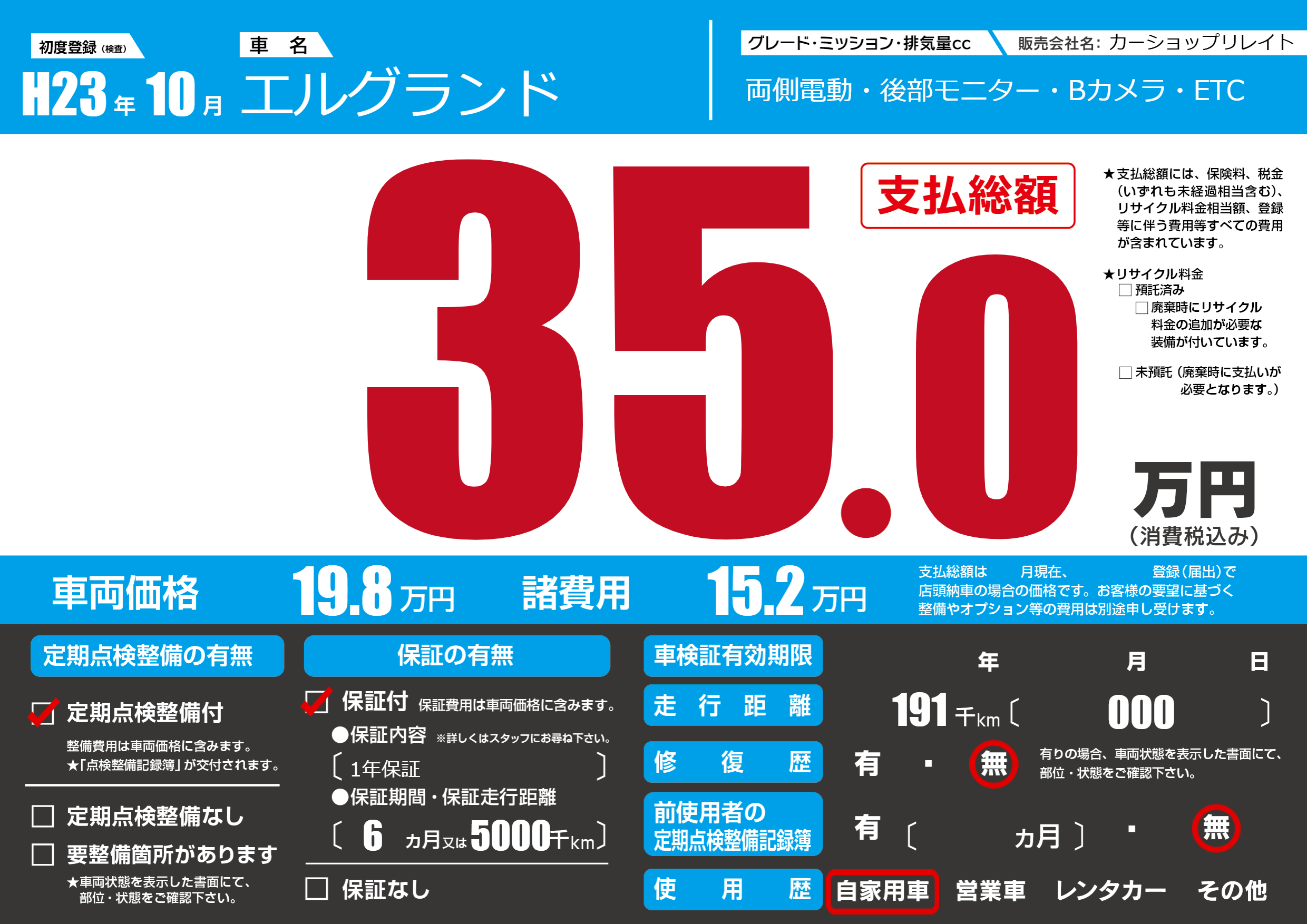 | 走行キロ | 19.1万km | 初年度登録 | H23年10月 |