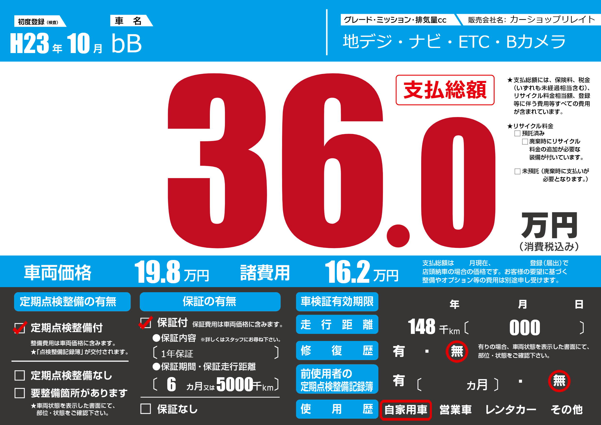 | 走行キロ | 14.8万km | 初年度登録 | H23年10月 |