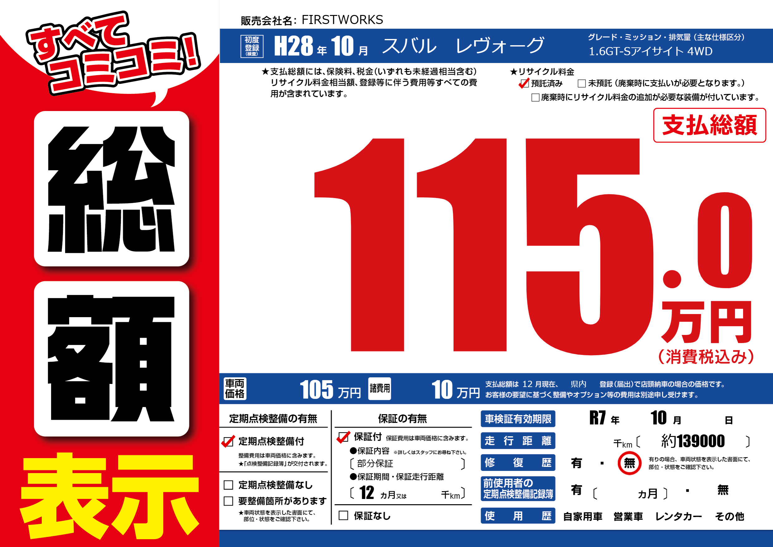 | 車名 | スバル レヴォーグ | グレード ミッション 排気量 |