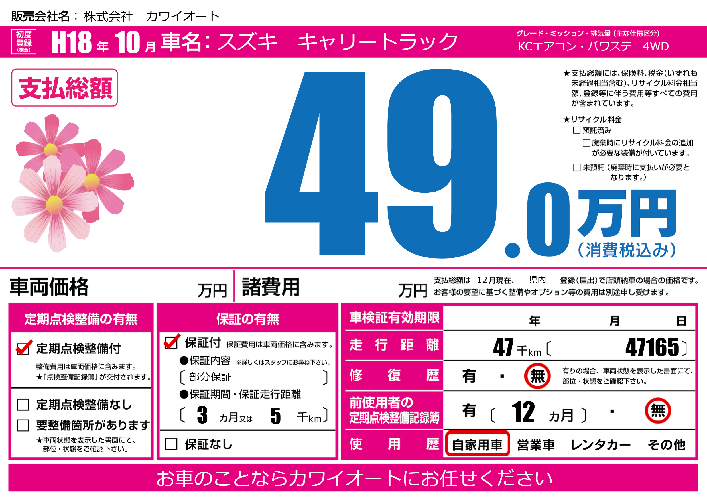 | 走行キロ | 4.7万km | 初年度登録 | H18年10月 |