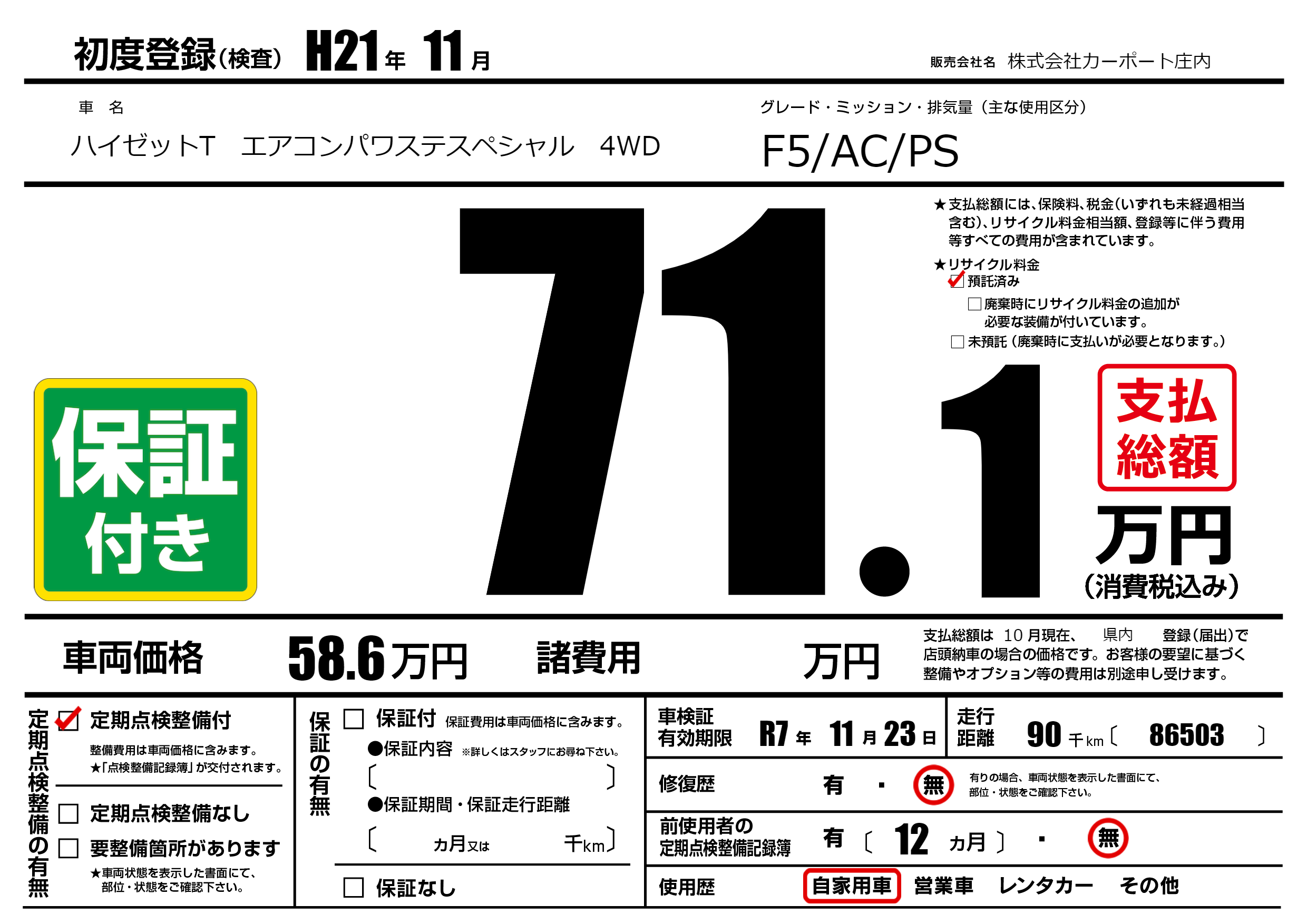 | 走行キロ | 9万km | 初年度登録 | H21年11月 |