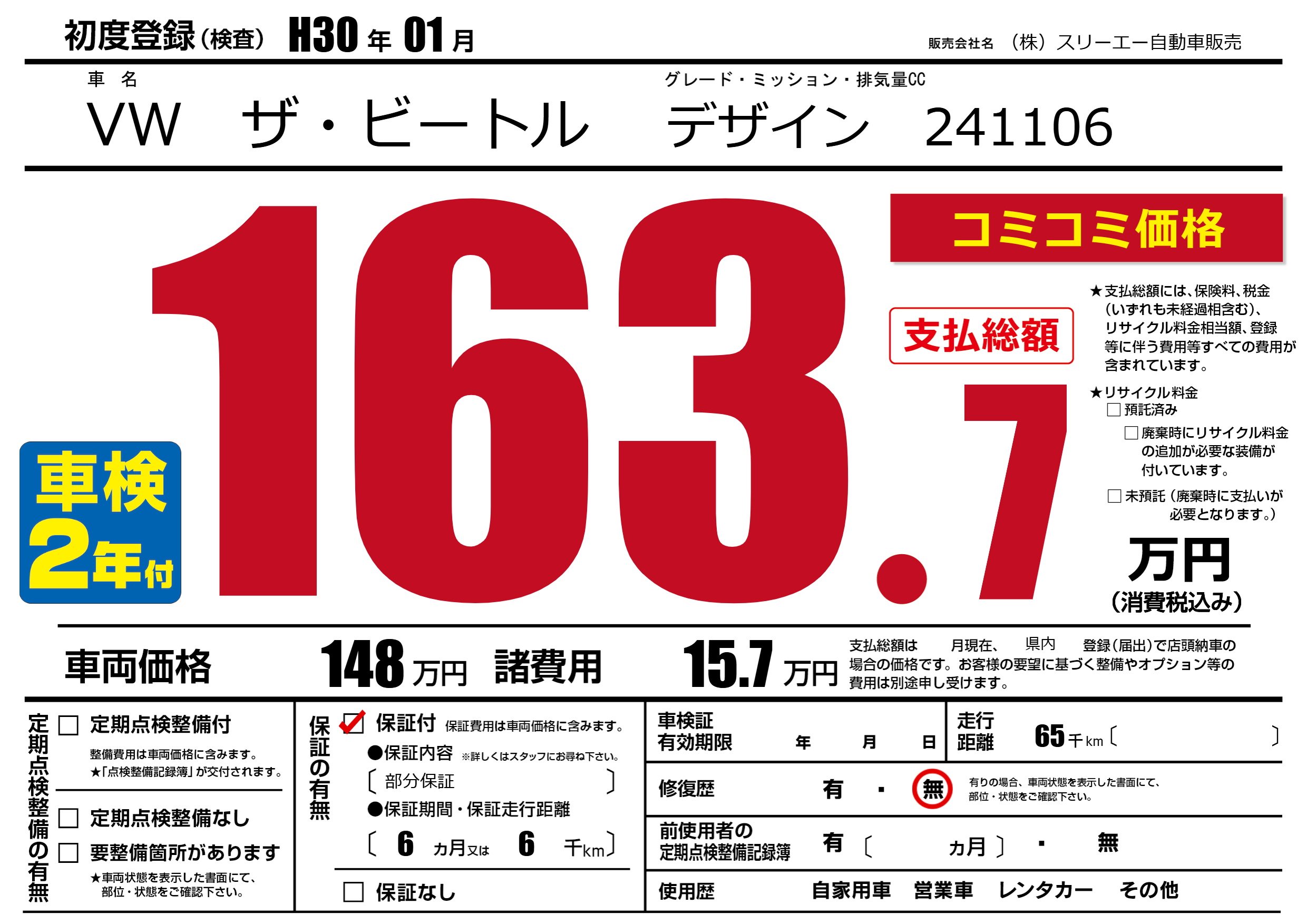 | 車名 | VW ザ・ビートル | グレード ミッション 排気量 |