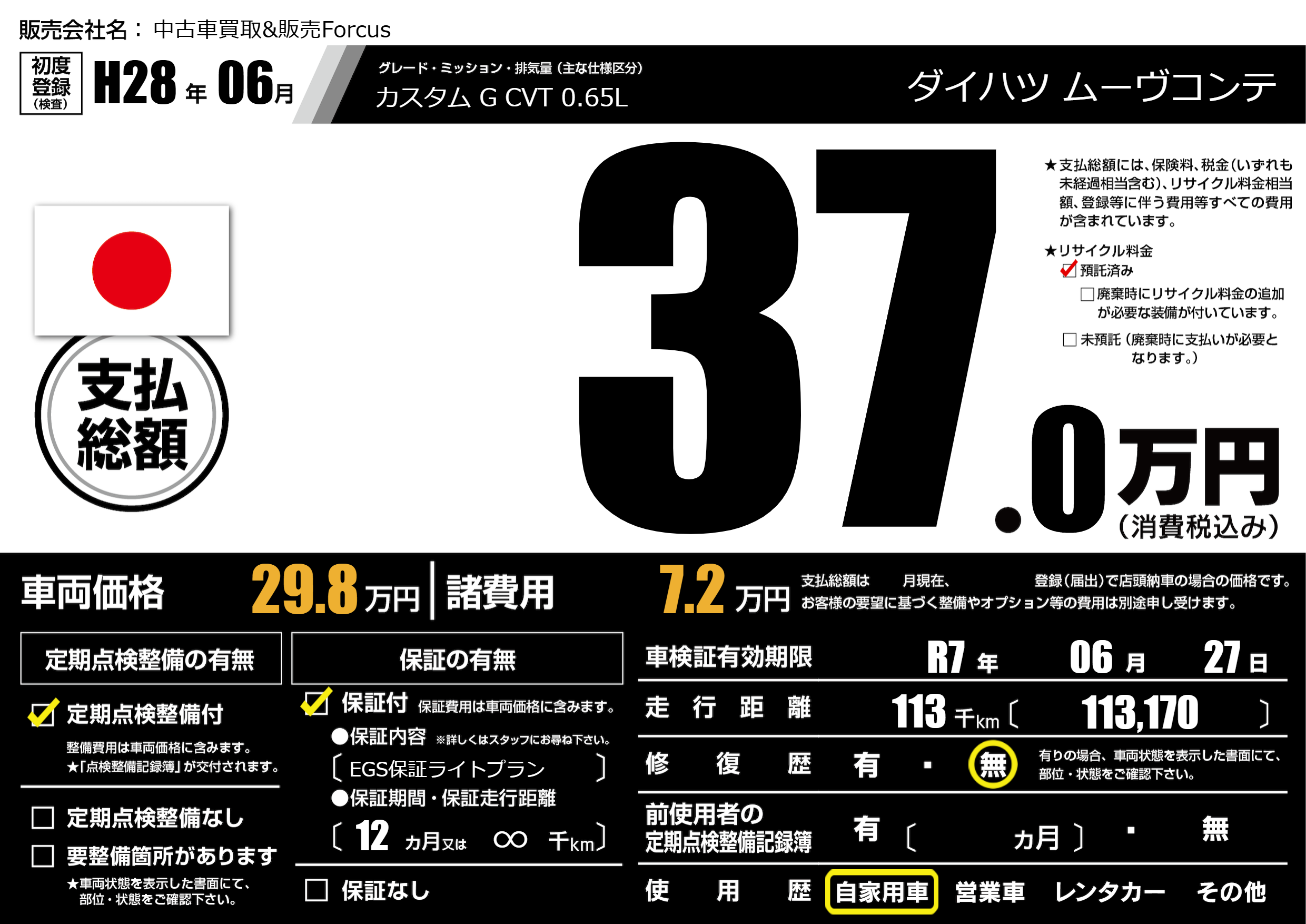 | 走行キロ | 11.3万km | 初年度登録 | H28年06月 |