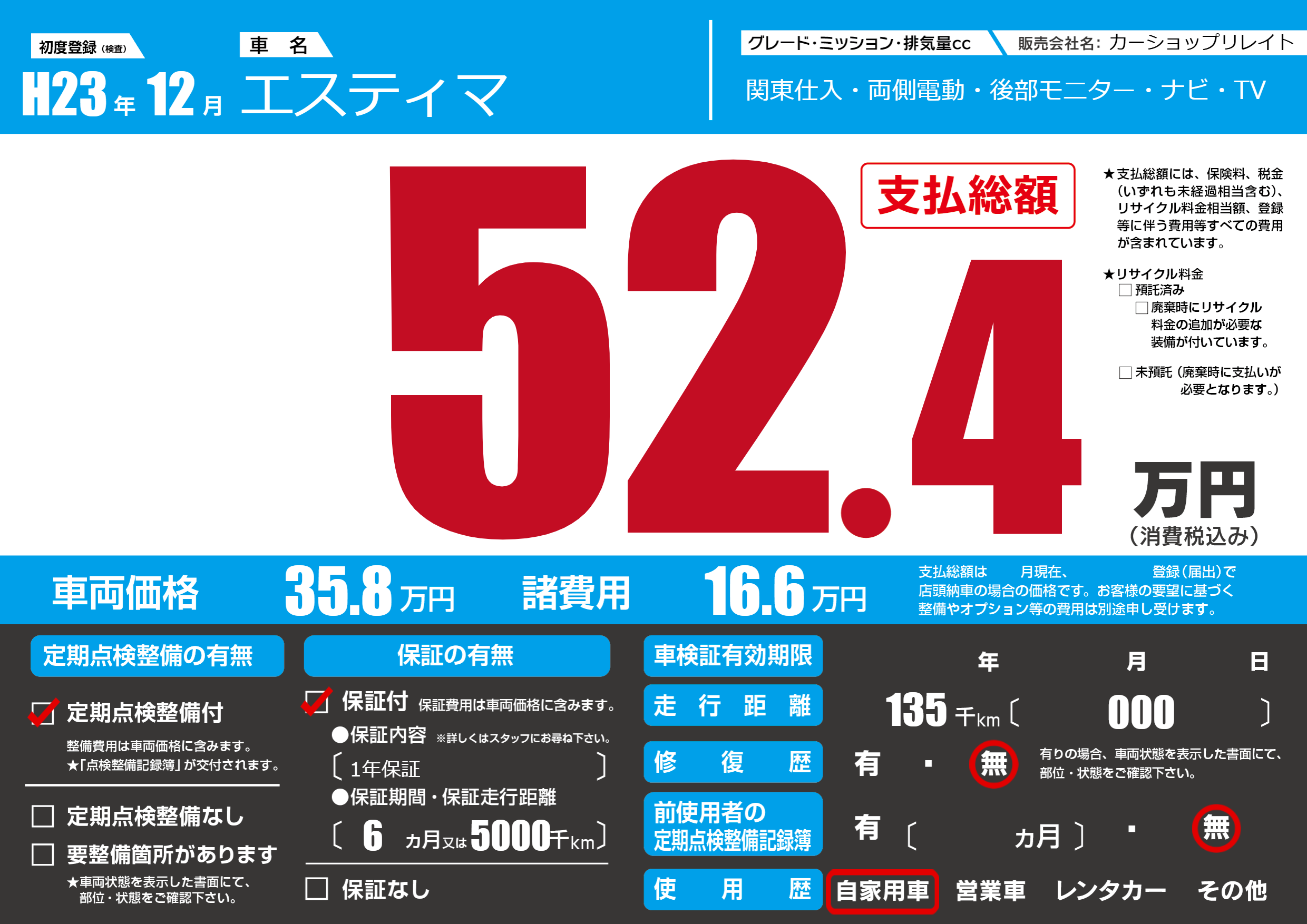 保証付き 保証内容(1年保証) 6ヶ月または(5000)千kmまで |
