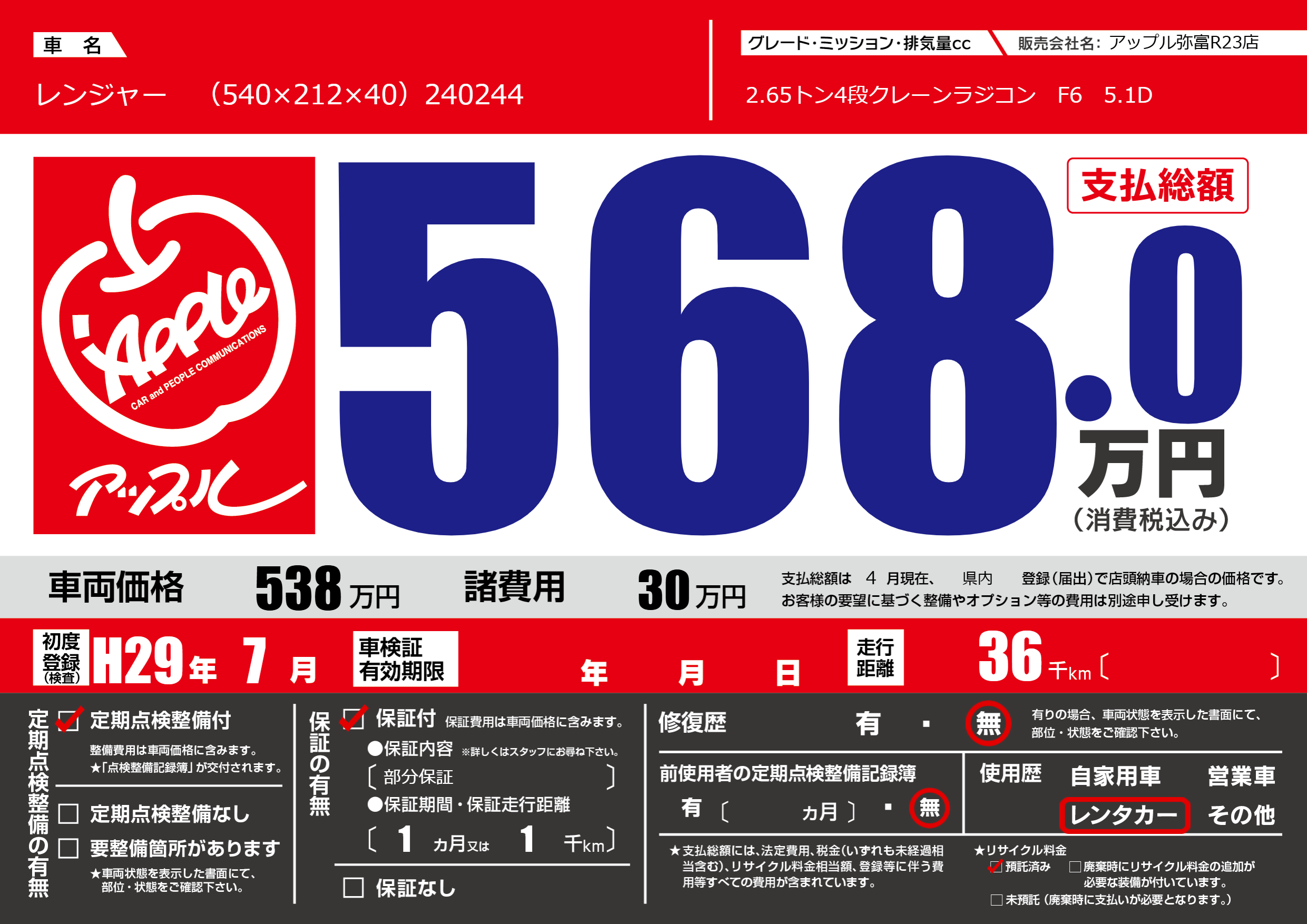 | 車名 | レンジャー (540×212×40)240244 | グレード ミッション 排気量 |