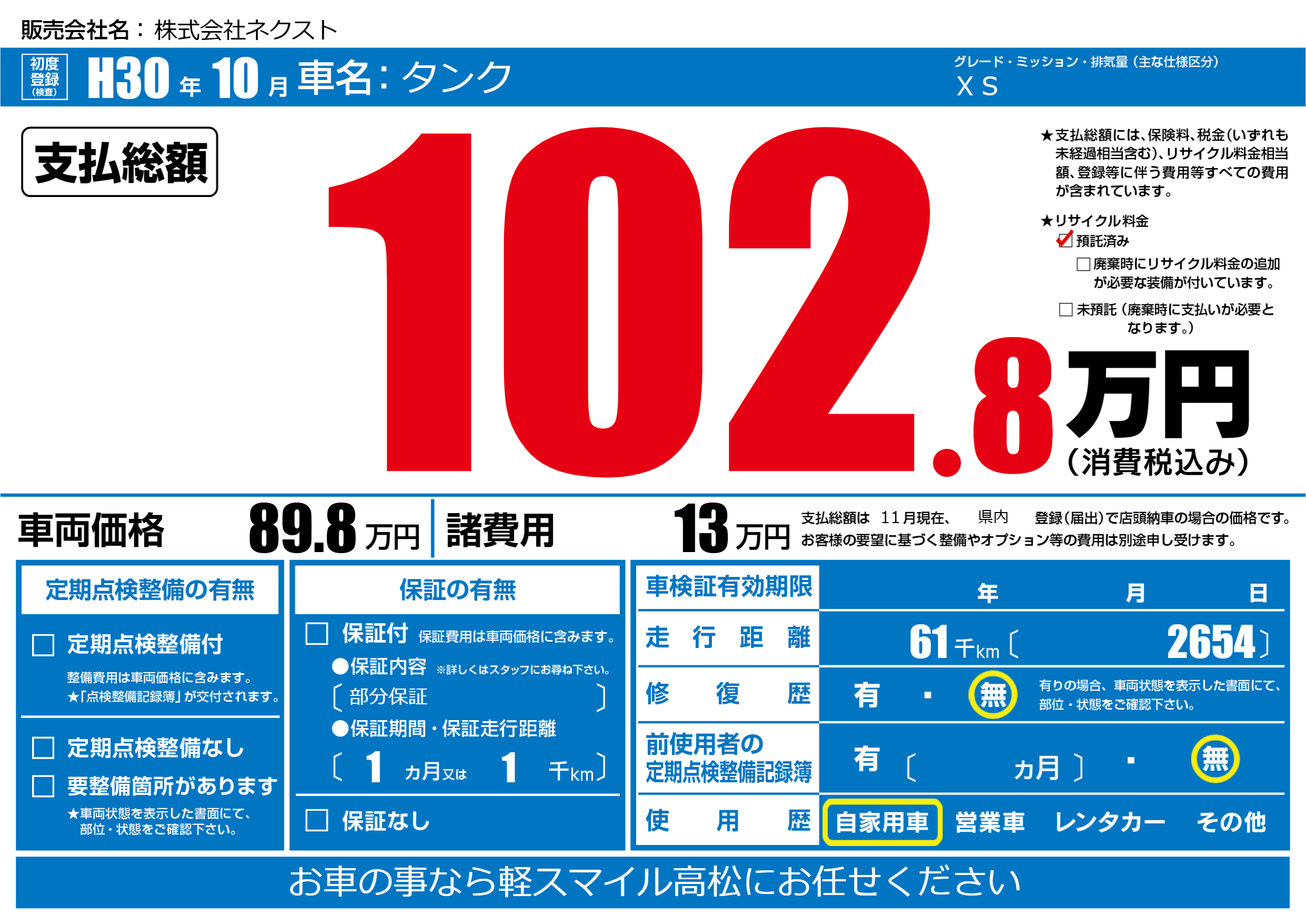 | 走行キロ | 6.1万km | 初年度登録 | H30年10月 |