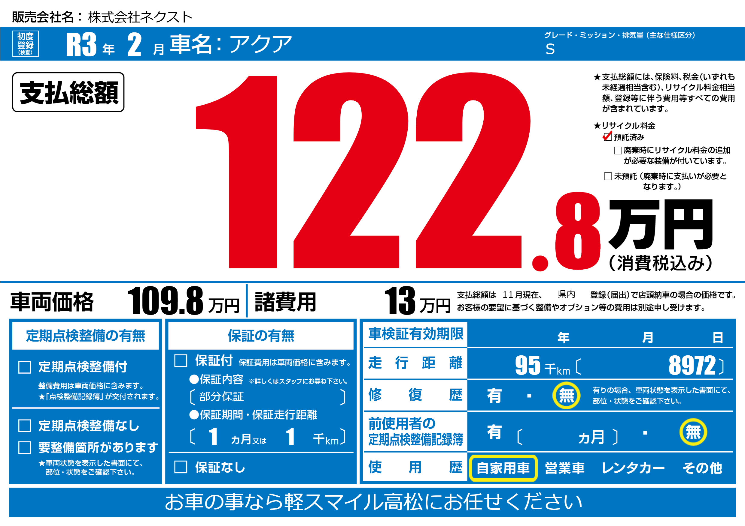 あり | リサイクル預託金相当額 | ( 0円)が別途必要 |