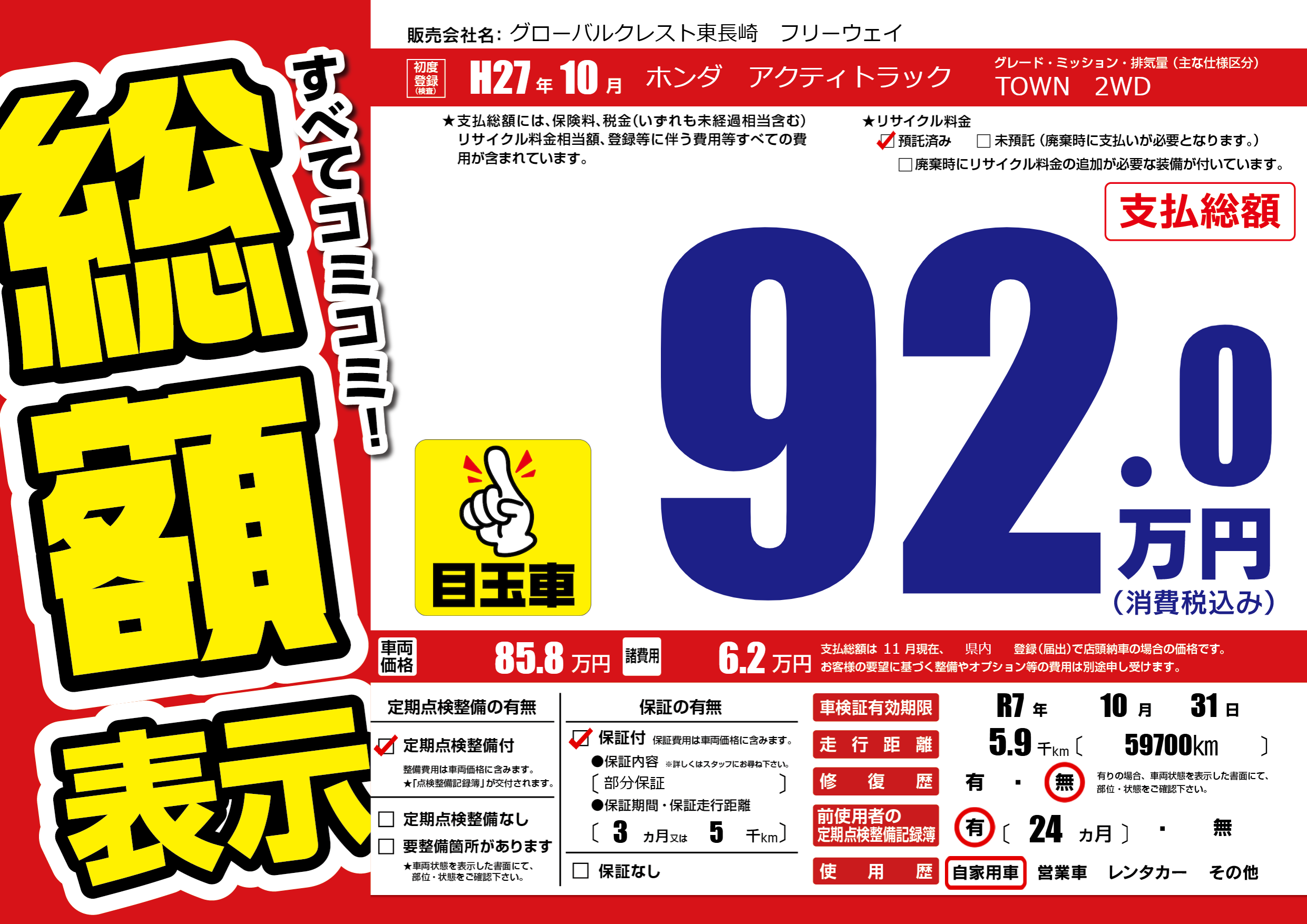 | 車名 | ホンダ アクティトラック | グレード ミッション 排気量 |