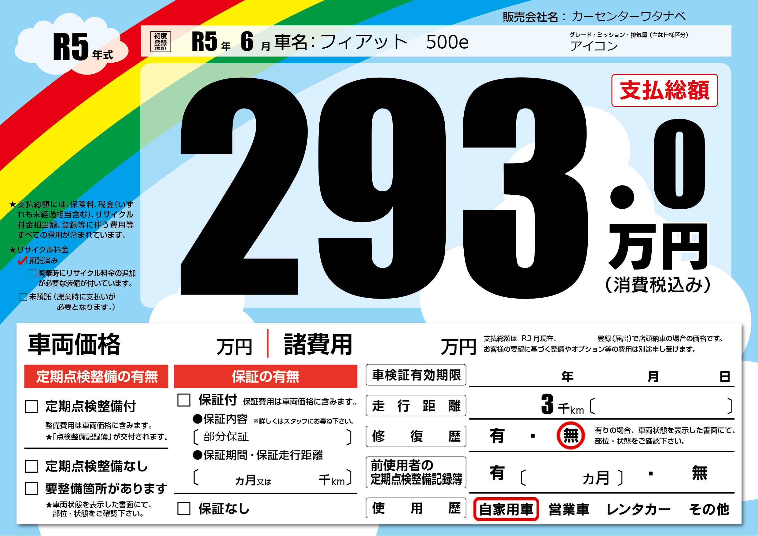 | 車名 | フィアット 500e | グレード ミッション 排気量 |