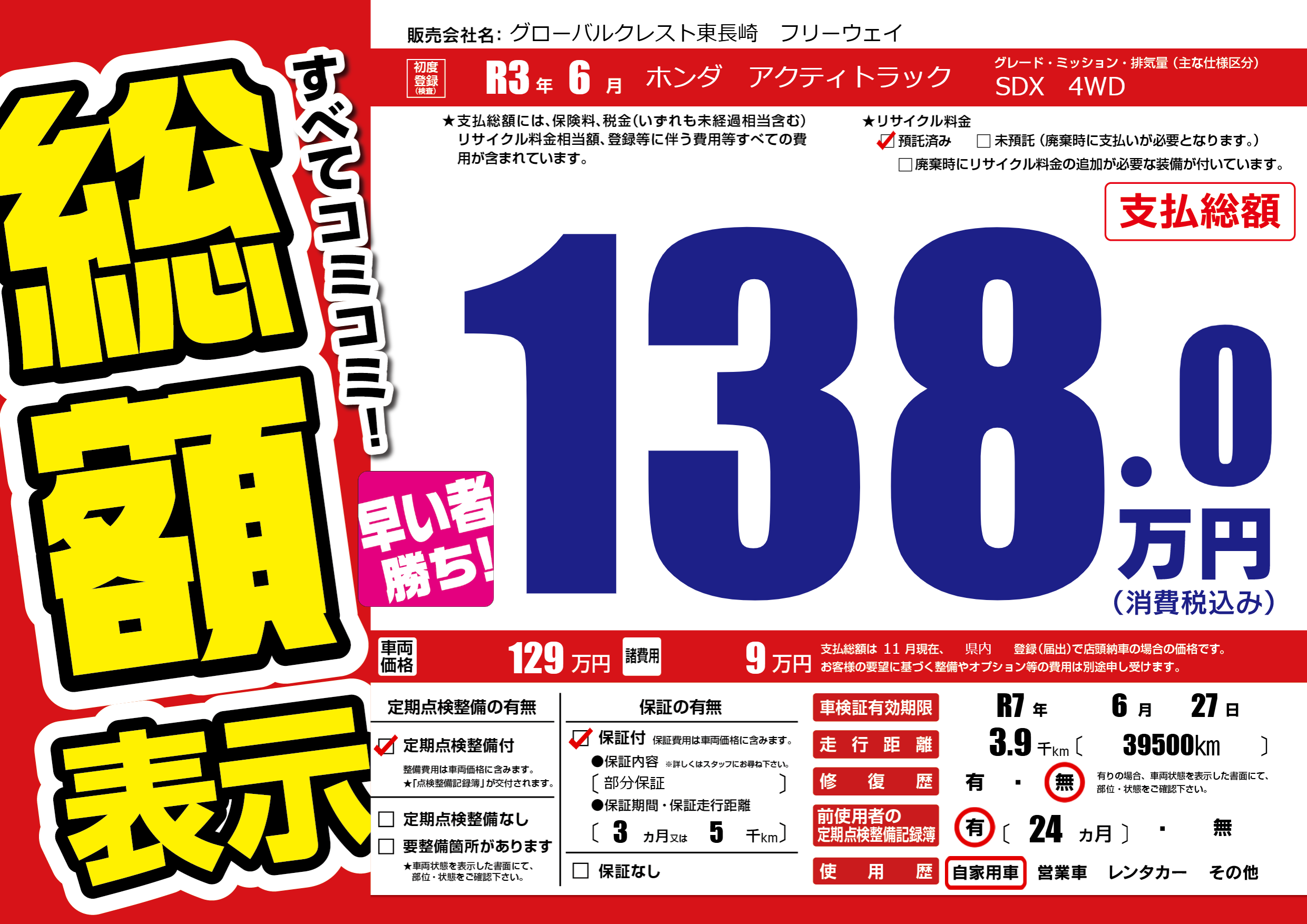なし | 車検制限 | R7年6月27月 |
