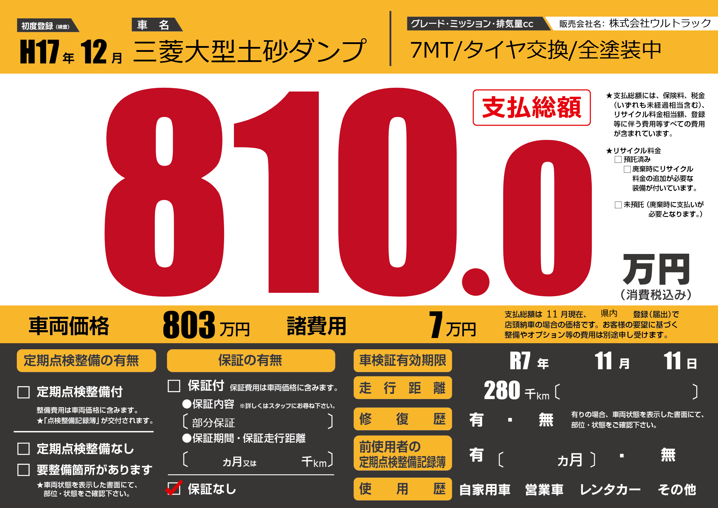 | 車名 | 三菱大型土砂ダンプ | グレード ミッション 排気量 |