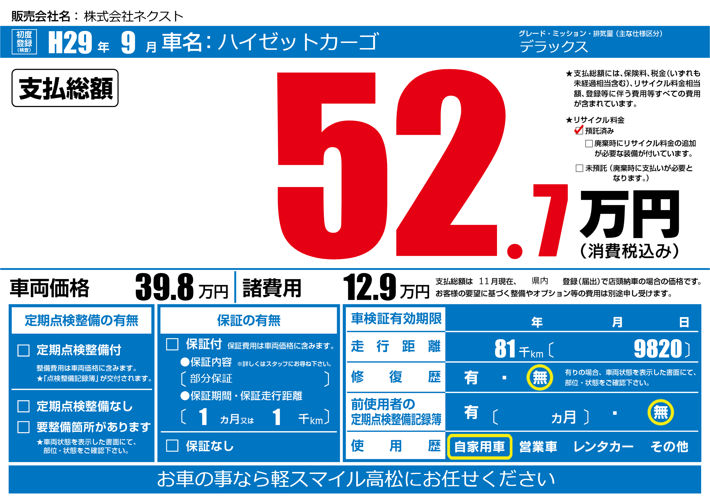 | 車名 | ハイゼットカーゴ | グレード ミッション 排気量 |